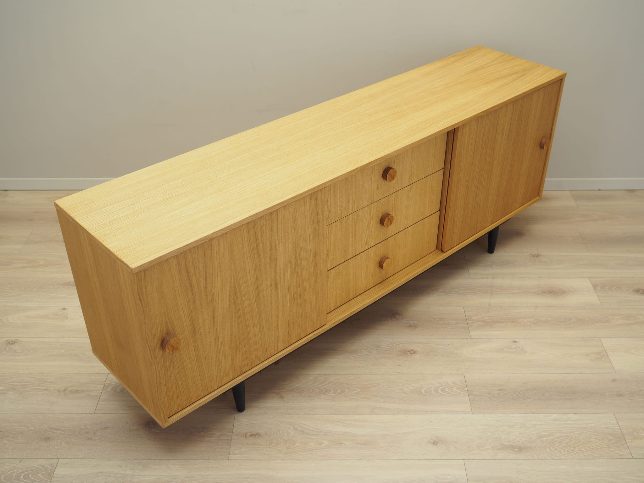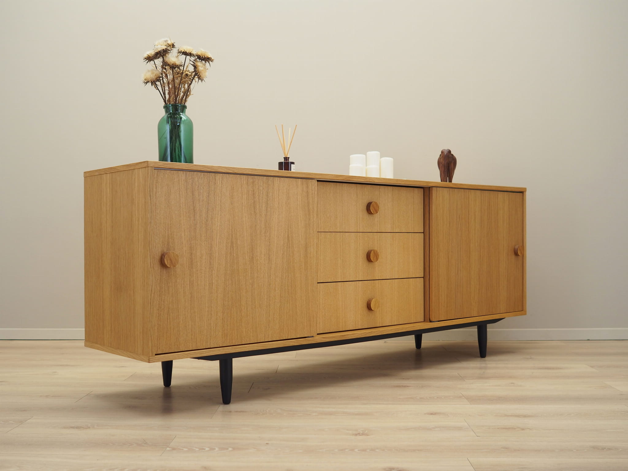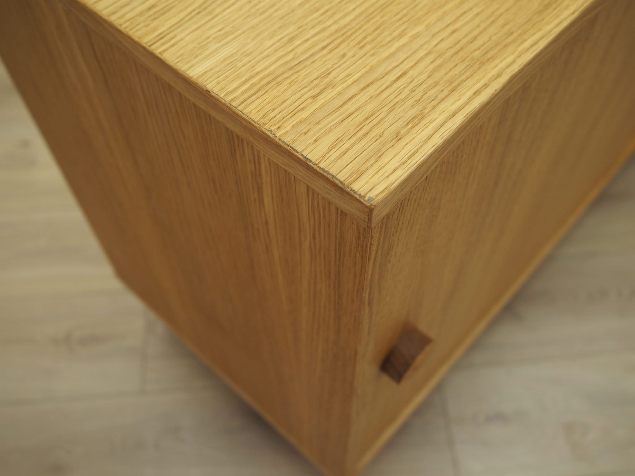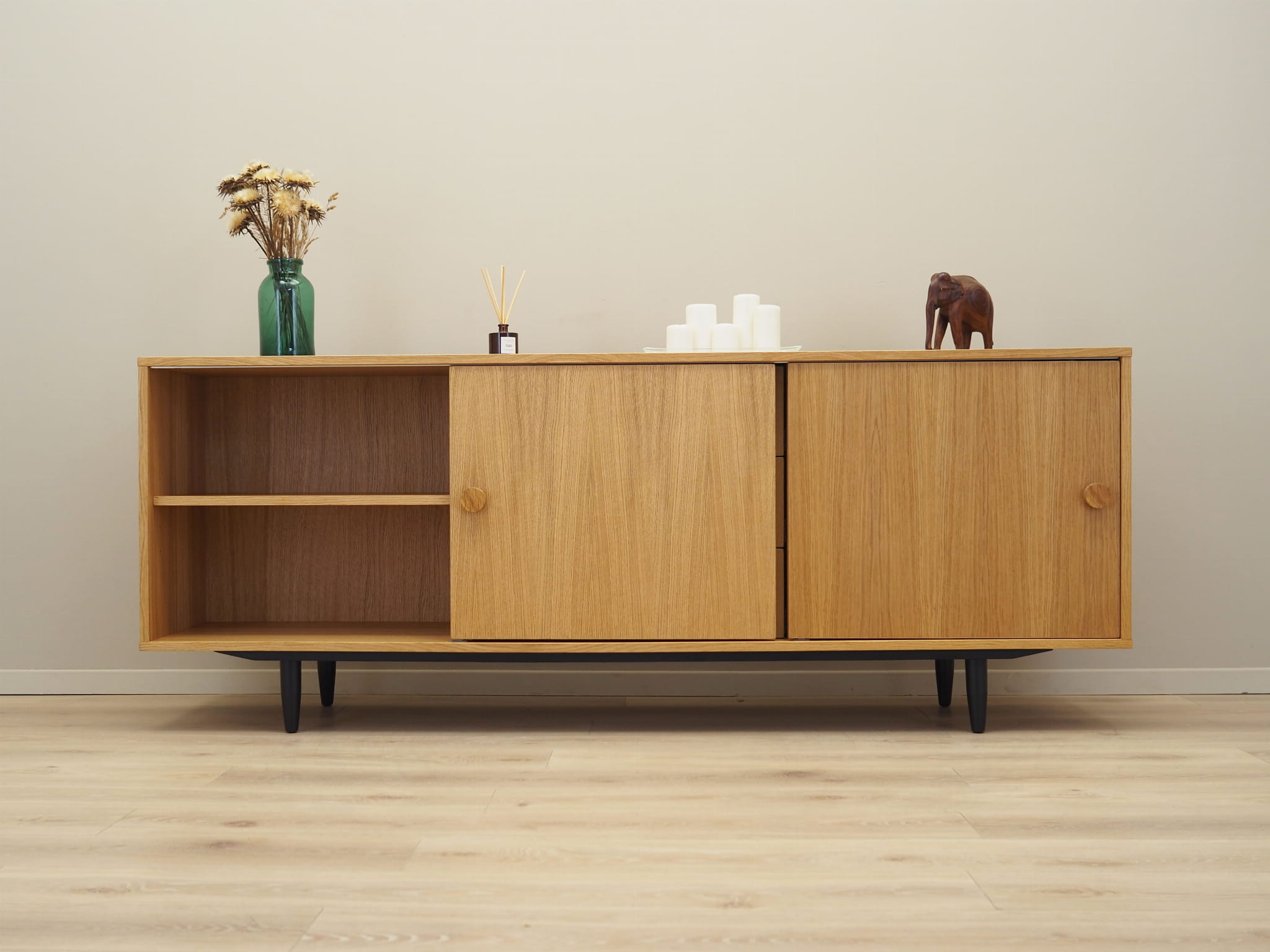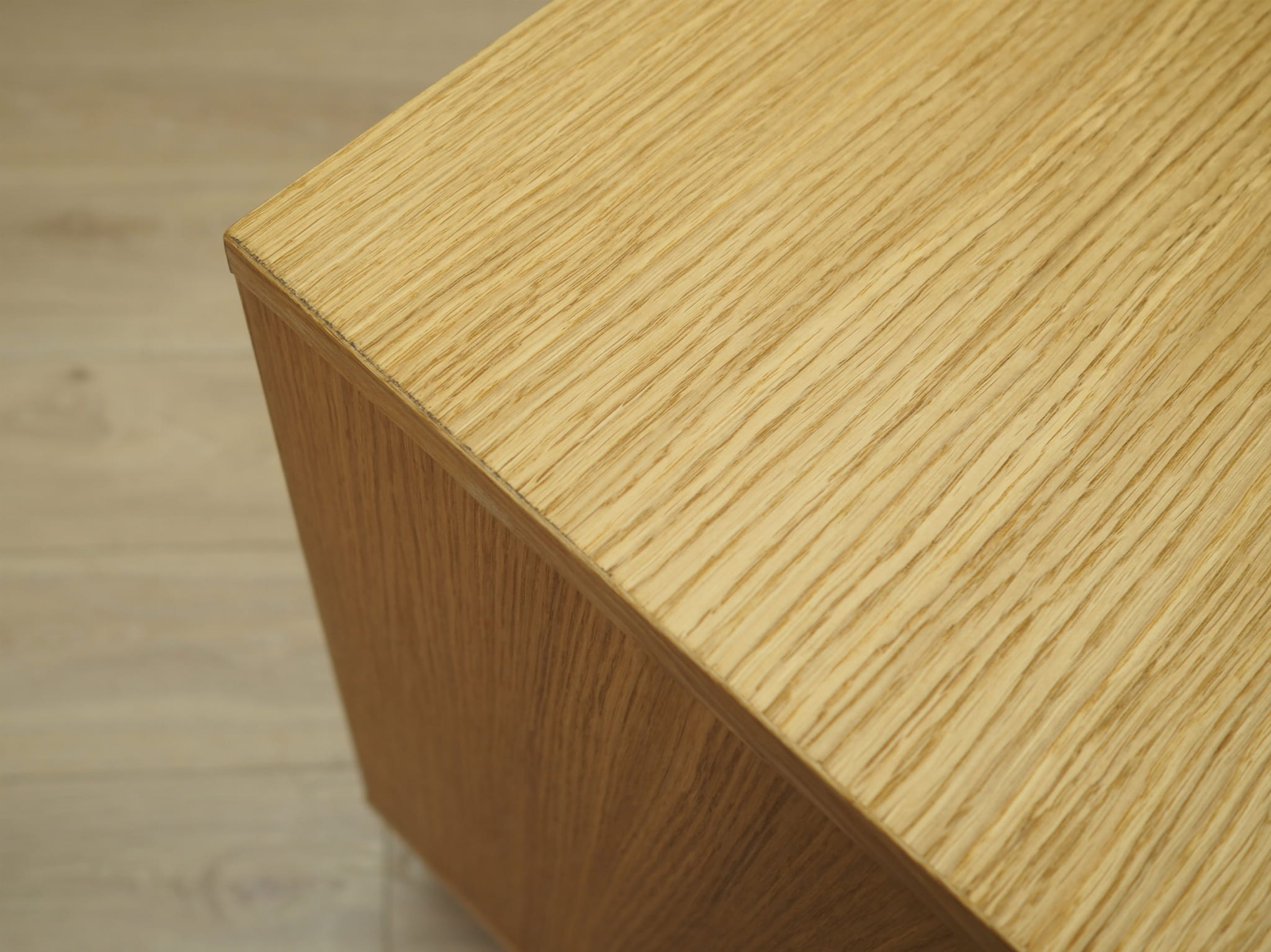 Konstrukcja pokryta jest fornirem dębowym. Nogi wykonane z litego drewna wybarwionego na kolor czarny. Powierzchnia po odświeżeniu. Wewnątrz przestrzeń została wypełniona dwiema praktycznymi półkami oraz trzema szufladami. Półki z możliwością regulacji wysokości. Mebel posiada praktyczne rozwiązanie drzwi przesuwnych, dzięki czemu ograniczamy konieczność pozostawienia dużej wolnej przestrzeni przed meblem jednocześnie nie ograniczając sobie dostępu do wnętrza mebla. Ponadto przesuwne drzwi są idealnym rozwiązaniem, aby wykorzystać mebel pod sprzęt stereo.