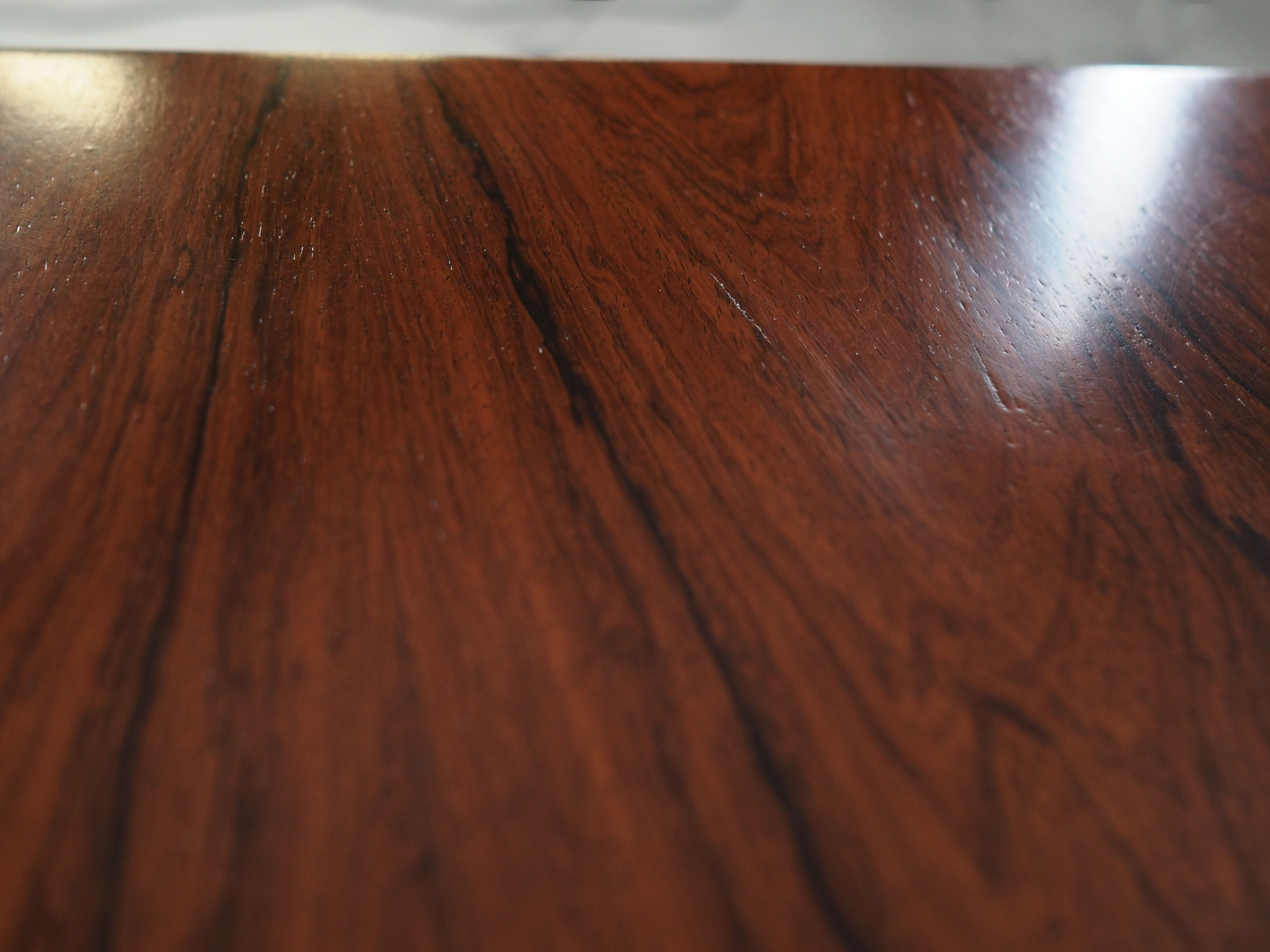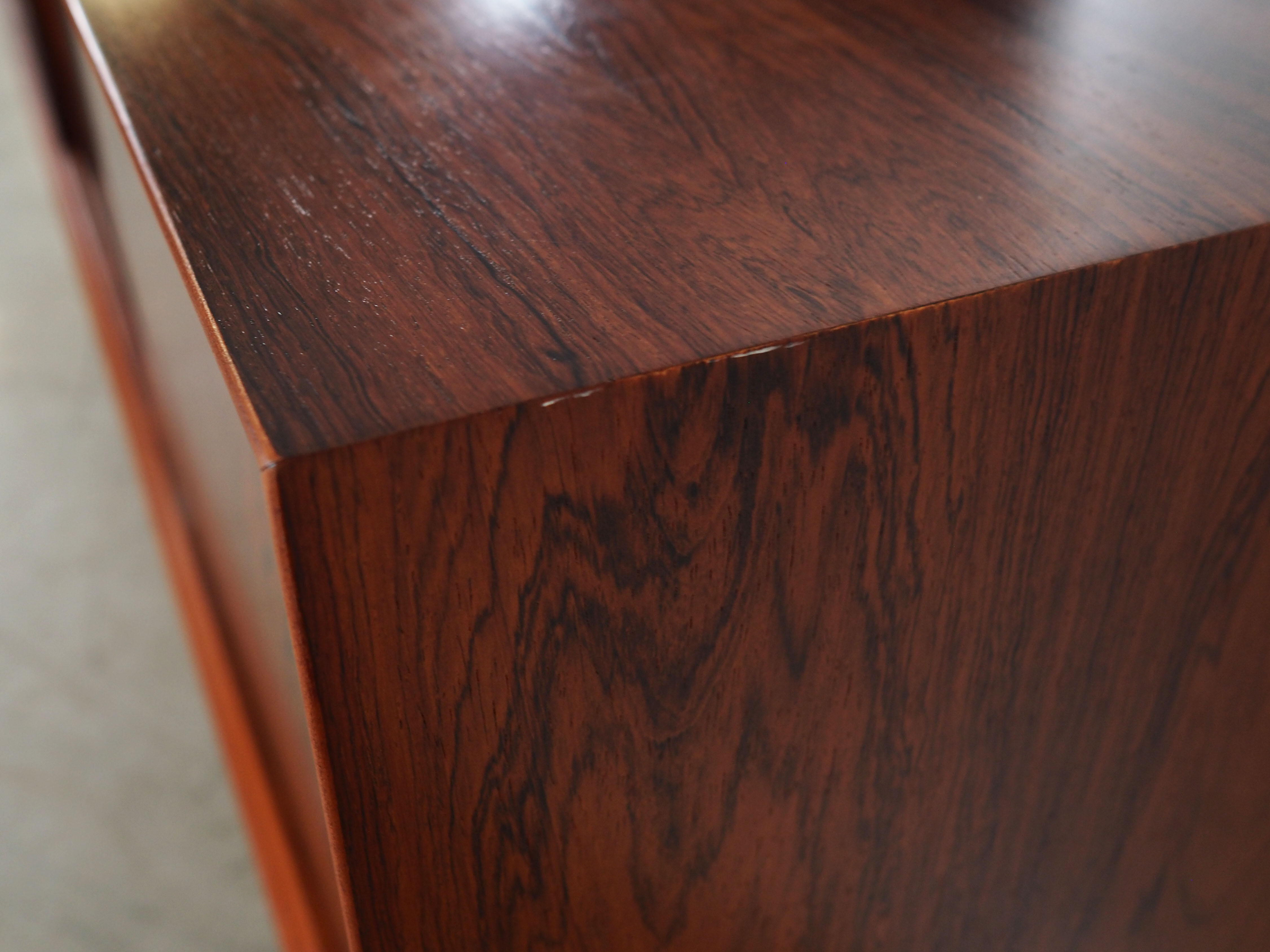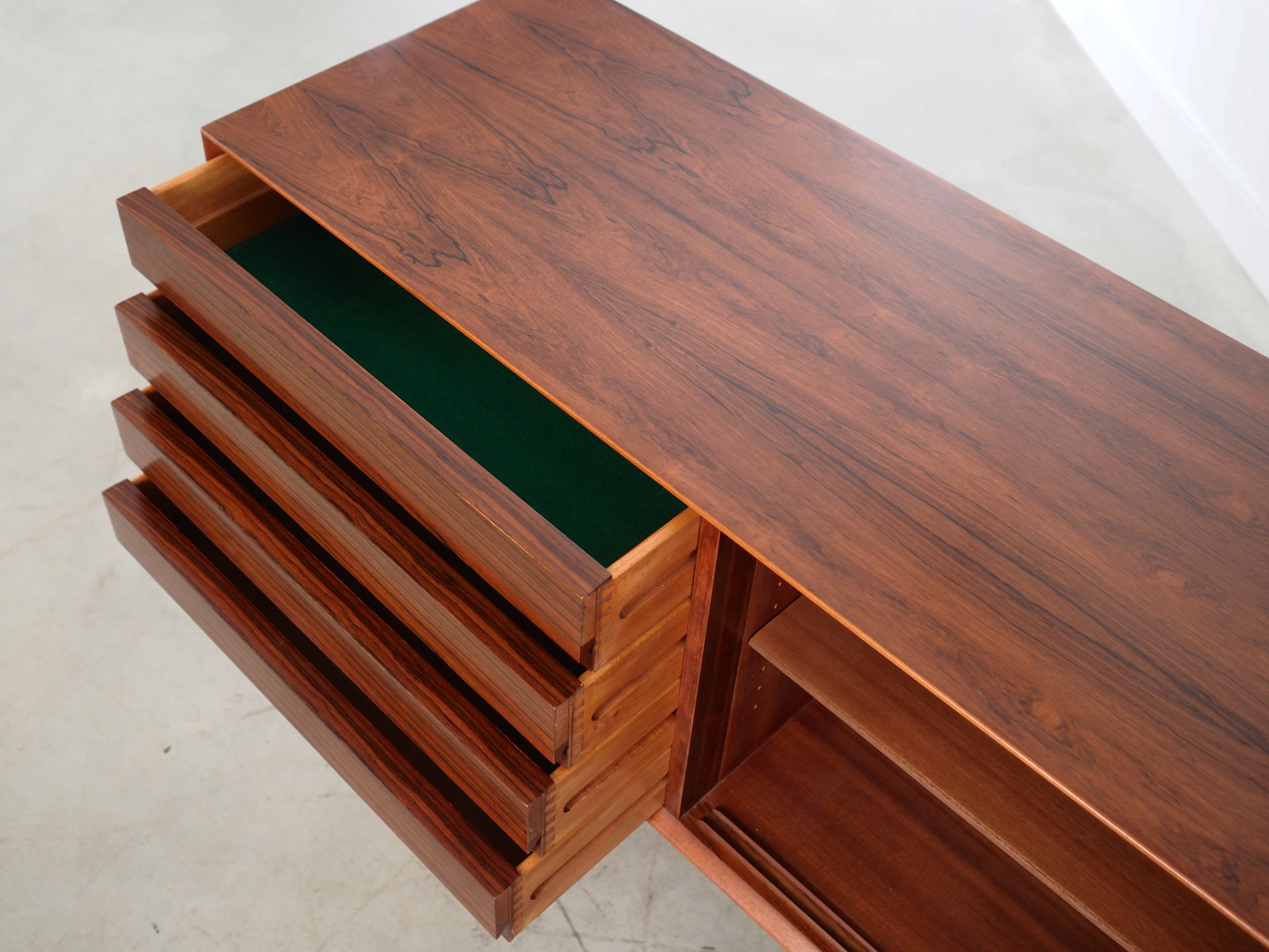 Konstrukcja pokryta jest fornirem palisandrowym. Nogi wykonane z litego drewna. Powierzchnia po odświeżeniu. Wewnątrz przestrzeń została wypełniona praktyczną półką z możliwością regulacji wysokości oraz czterema szufladami. Sideboard posiada wygodne rozwiązanie drzwi przesuwnych, dzięki czemu ograniczamy konieczność pozostawienia dużej wolnej przestrzeni przed meblem, jednocześnie nie ograniczając sobie dostępu do jego wnętrza. Ponadto drzwi przesuwne są idealnym rozwiązaniem, aby wykorzystać mebel pod sprzęt audio.