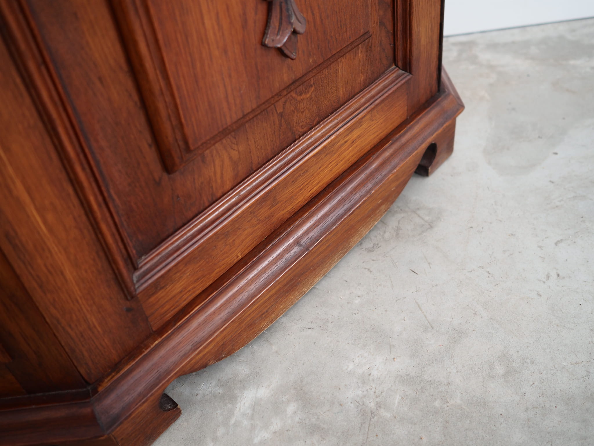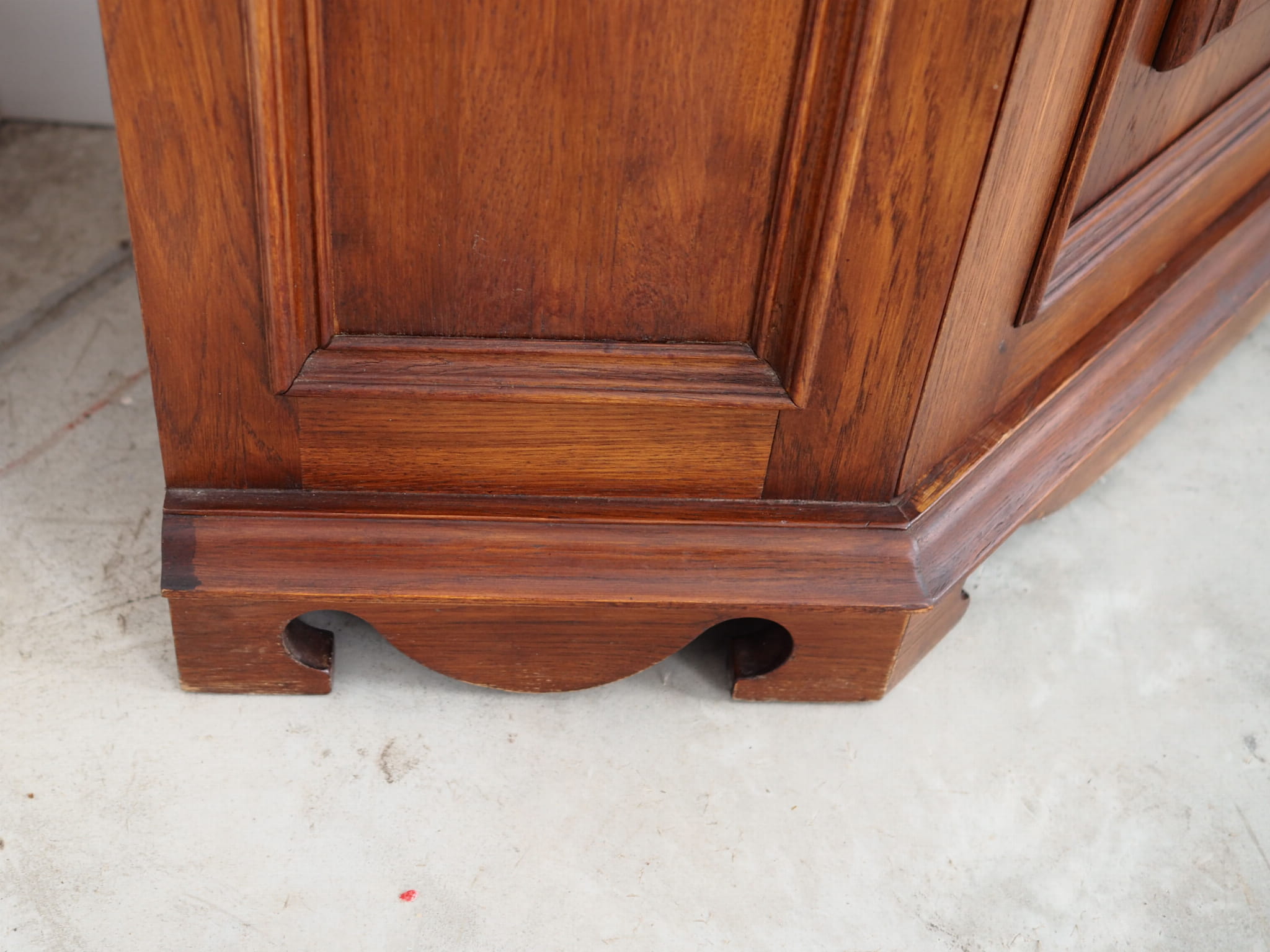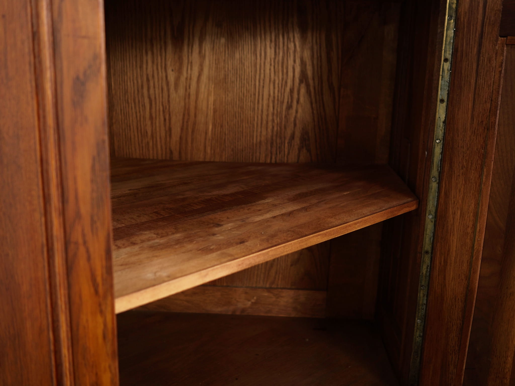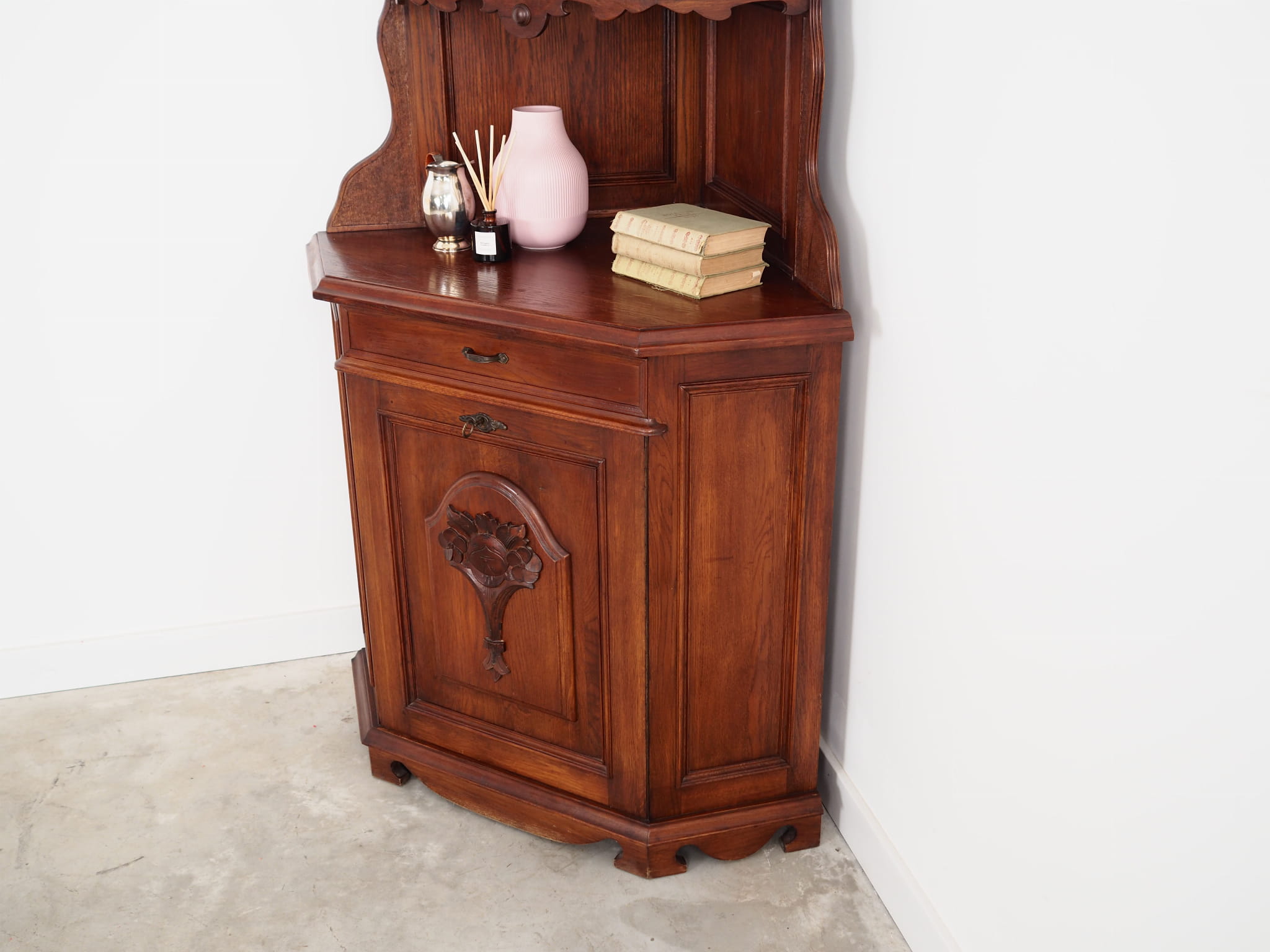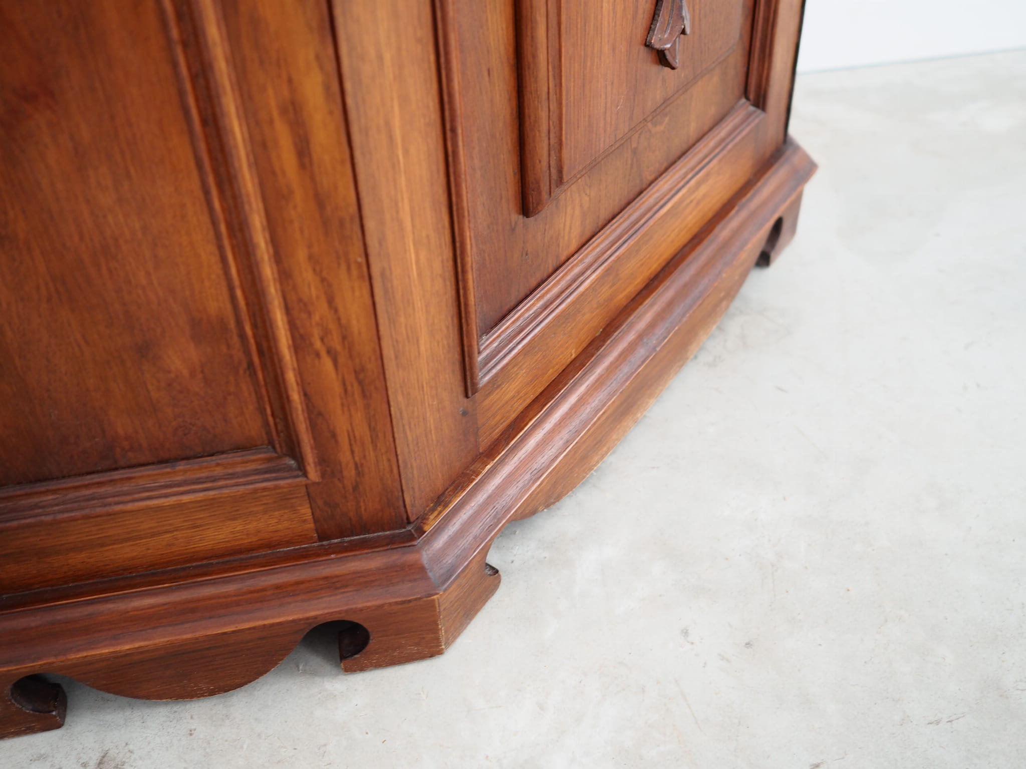 Konstrukcja wykonana z litego drewna dębowego. Powierzchnia po odświeżeniu. Wewnątrz przestrzeń została wypełniona dwiema pojemnymi szafkami oraz praktyczną szufladą. W szafkach umieszczono półki bez możliwości regulacji wysokości. Mebel z klasycznym rozwiązaniem drzwi otwieranych, dzięki czemu mamy swobodny dostęp do całego wnętrza mebla. Klucz w zestawie.