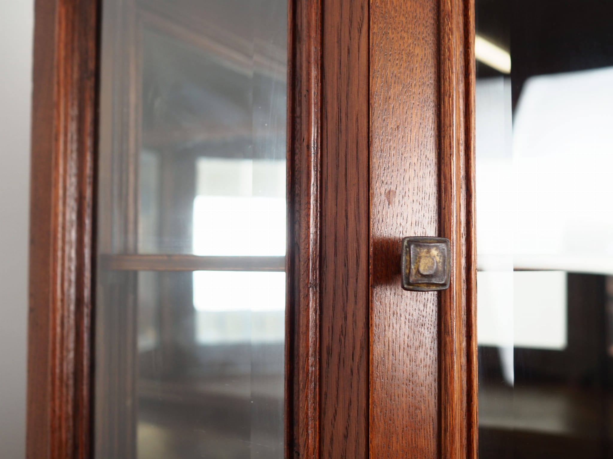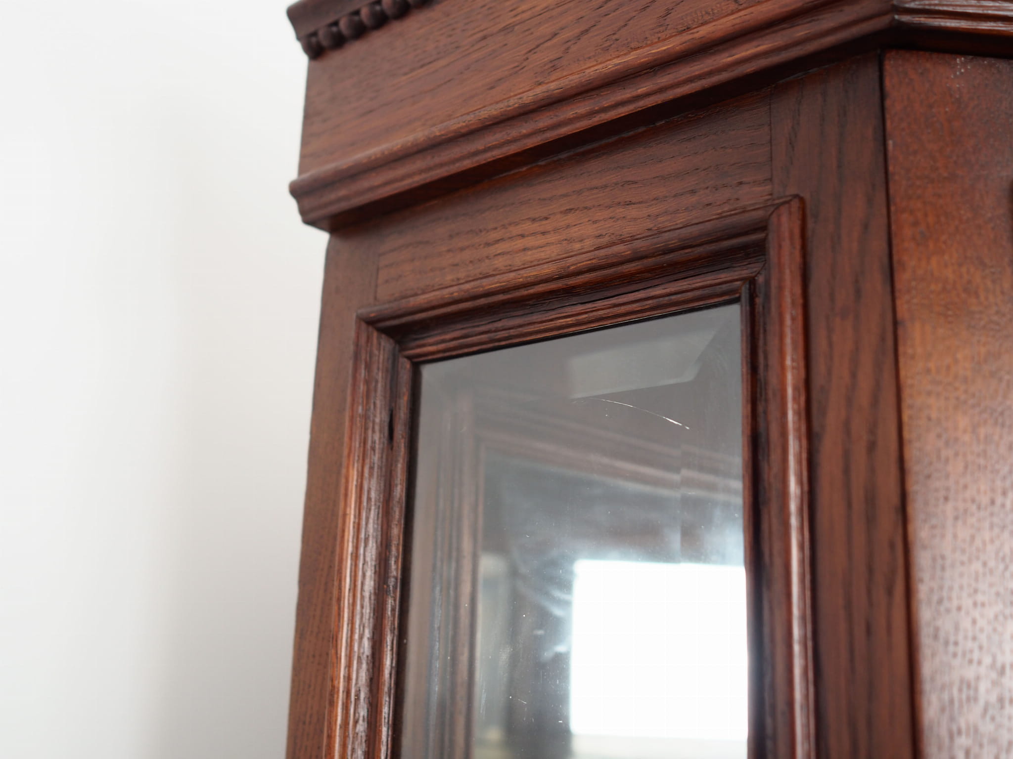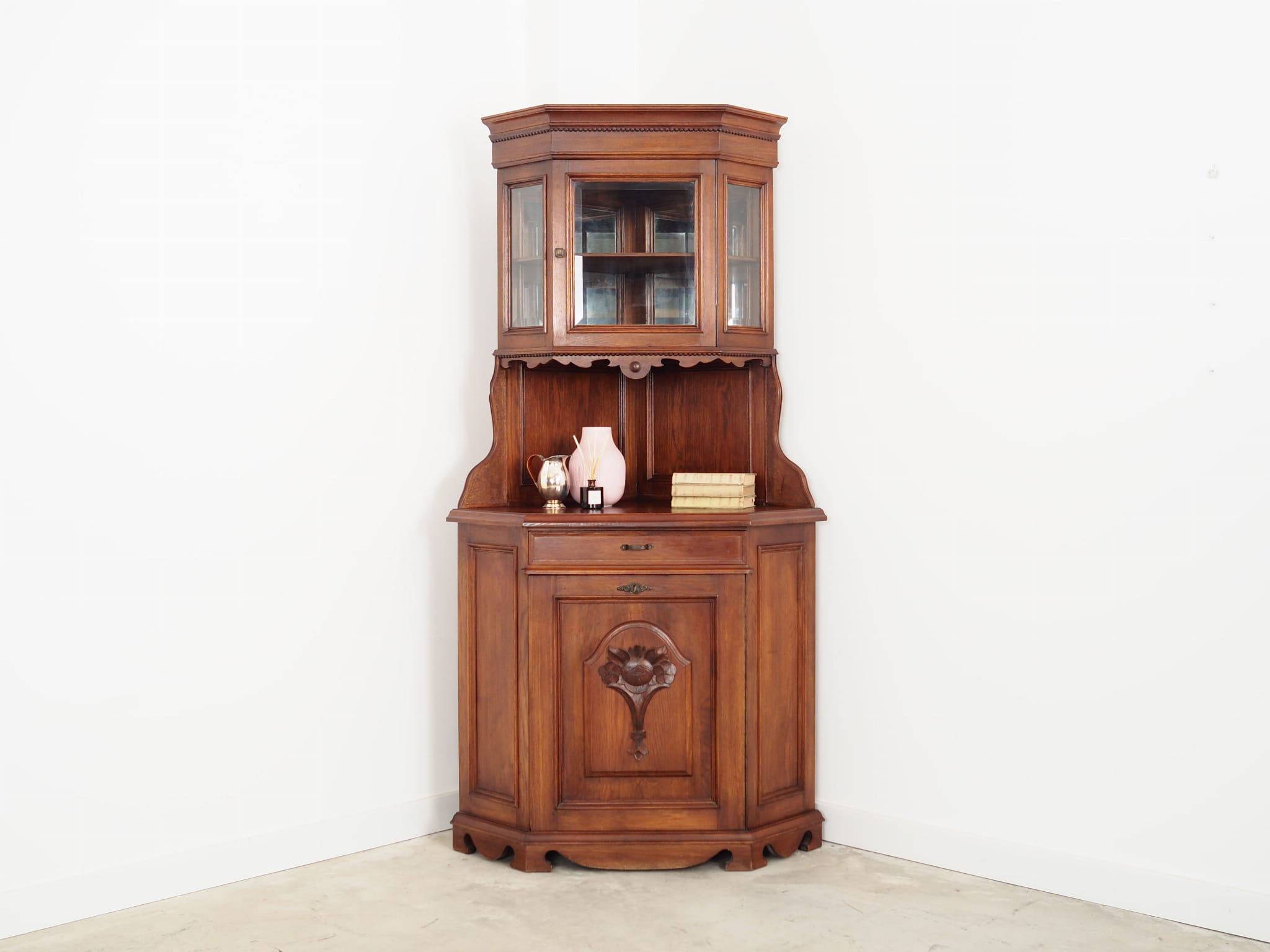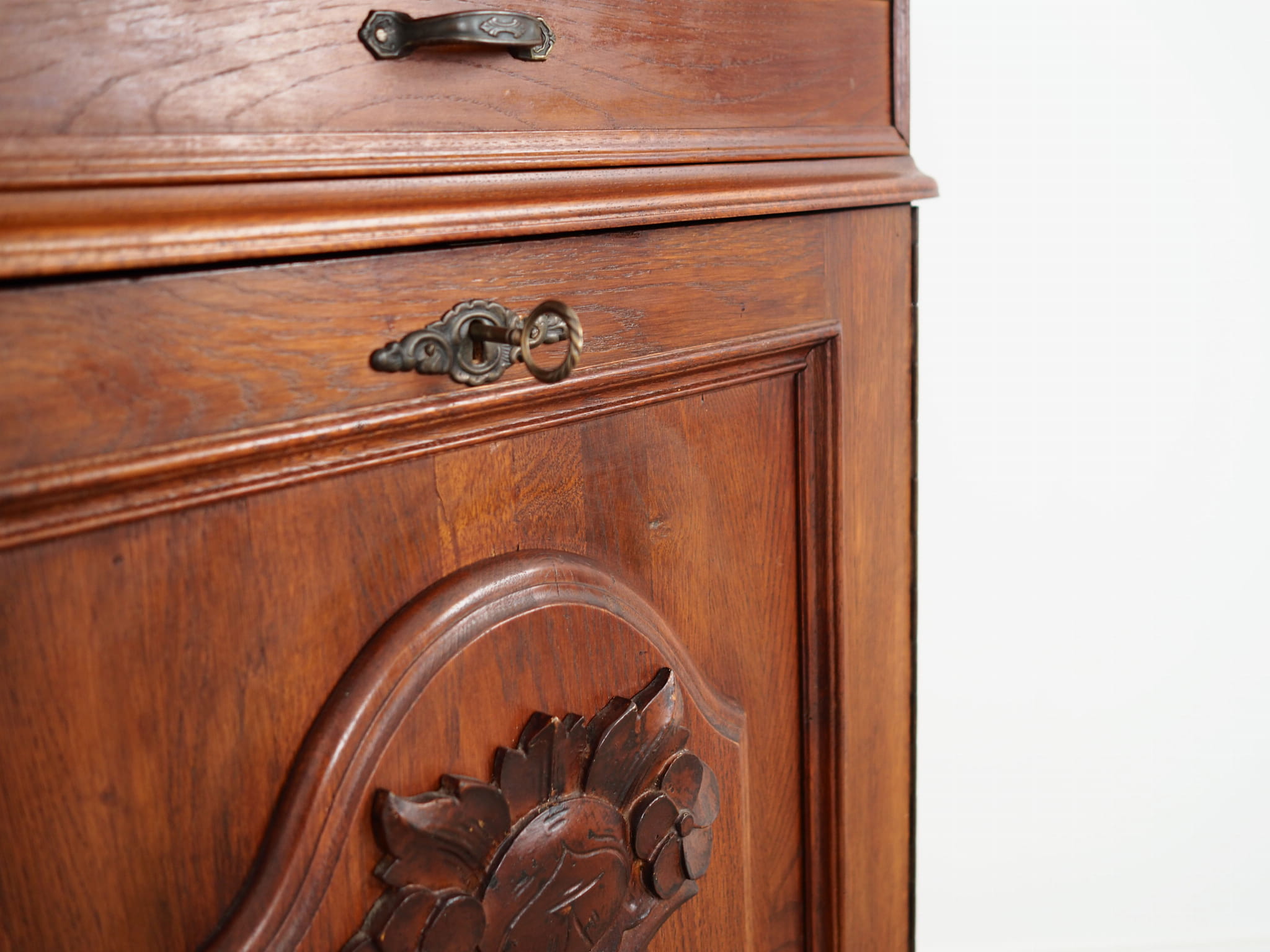 Konstrukcja wykonana z litego drewna dębowego. Powierzchnia po odświeżeniu. Wewnątrz przestrzeń została wypełniona dwiema pojemnymi szafkami oraz praktyczną szufladą. W szafkach umieszczono półki bez możliwości regulacji wysokości. Mebel z klasycznym rozwiązaniem drzwi otwieranych, dzięki czemu mamy swobodny dostęp do całego wnętrza mebla. Klucz w zestawie.