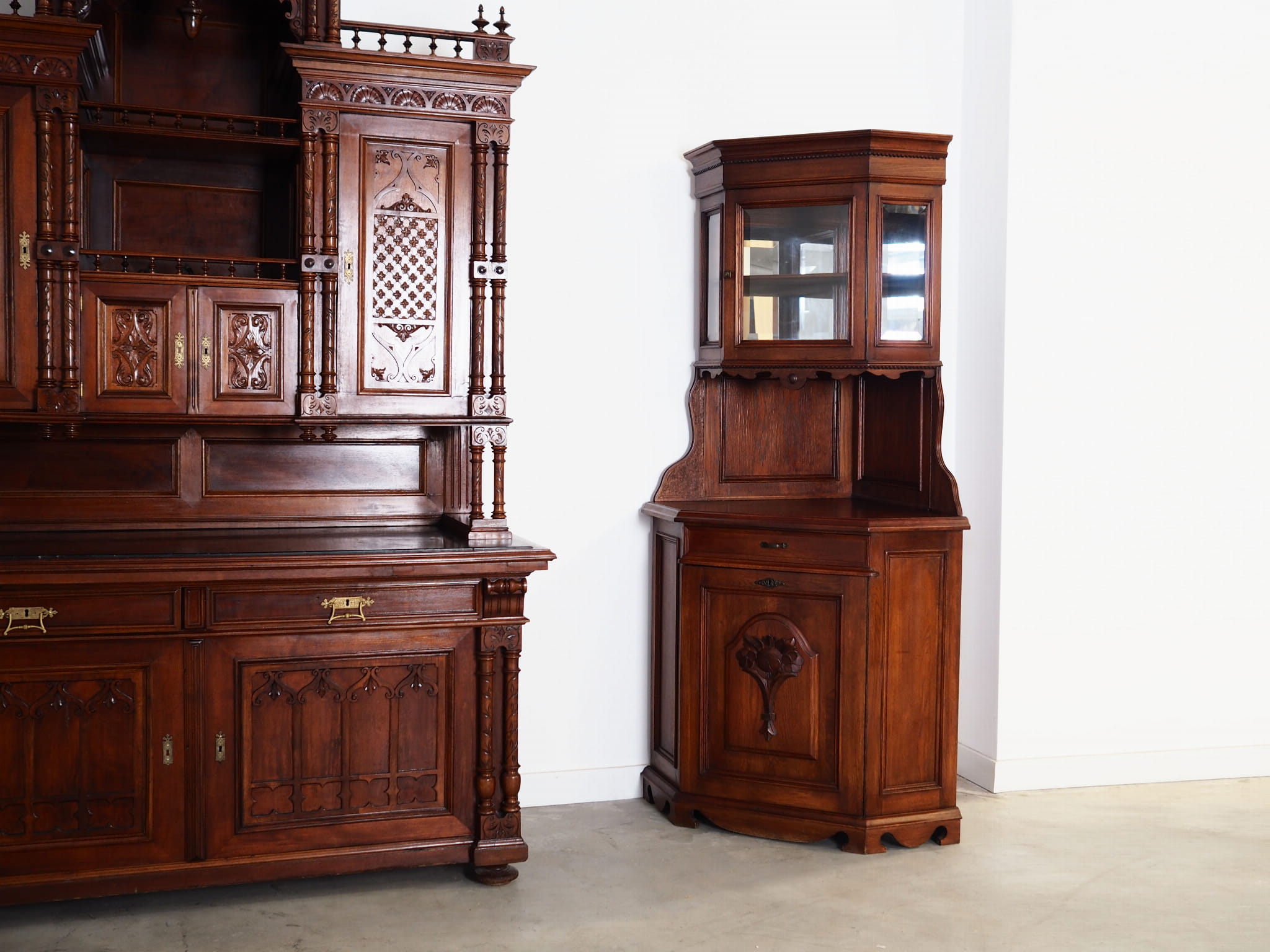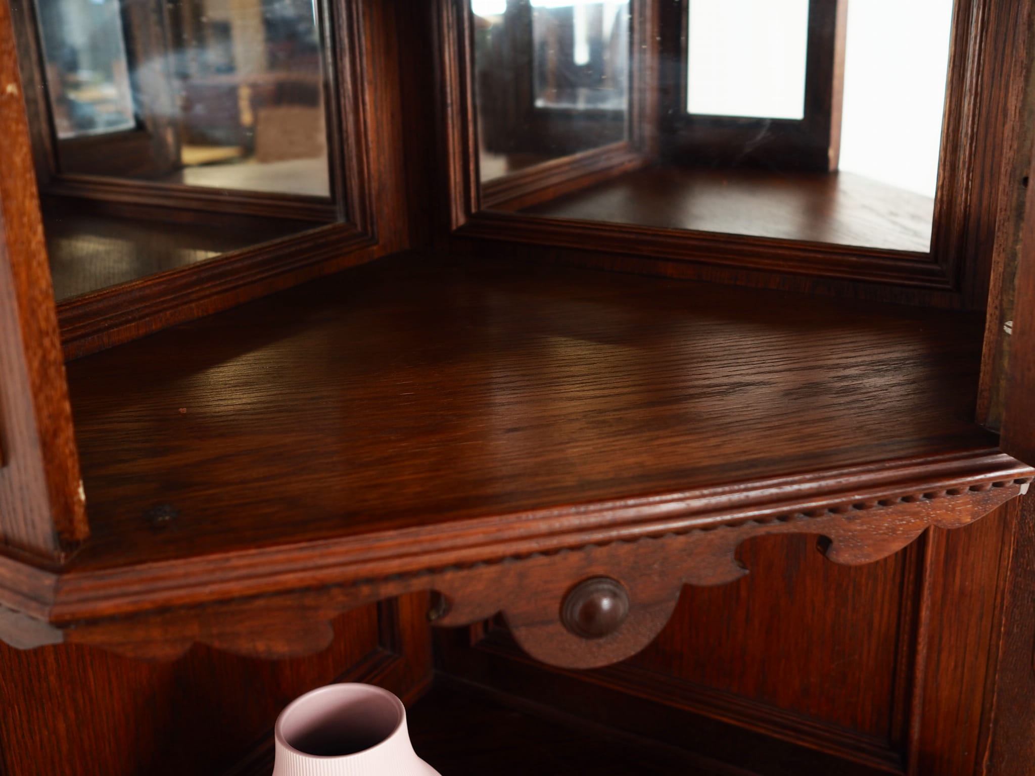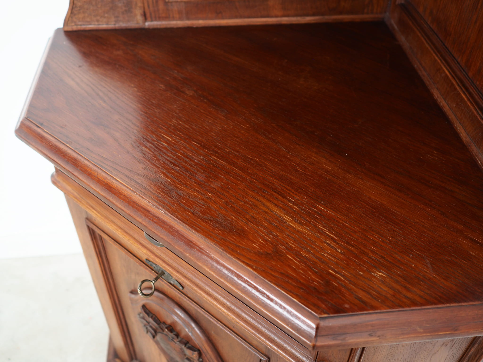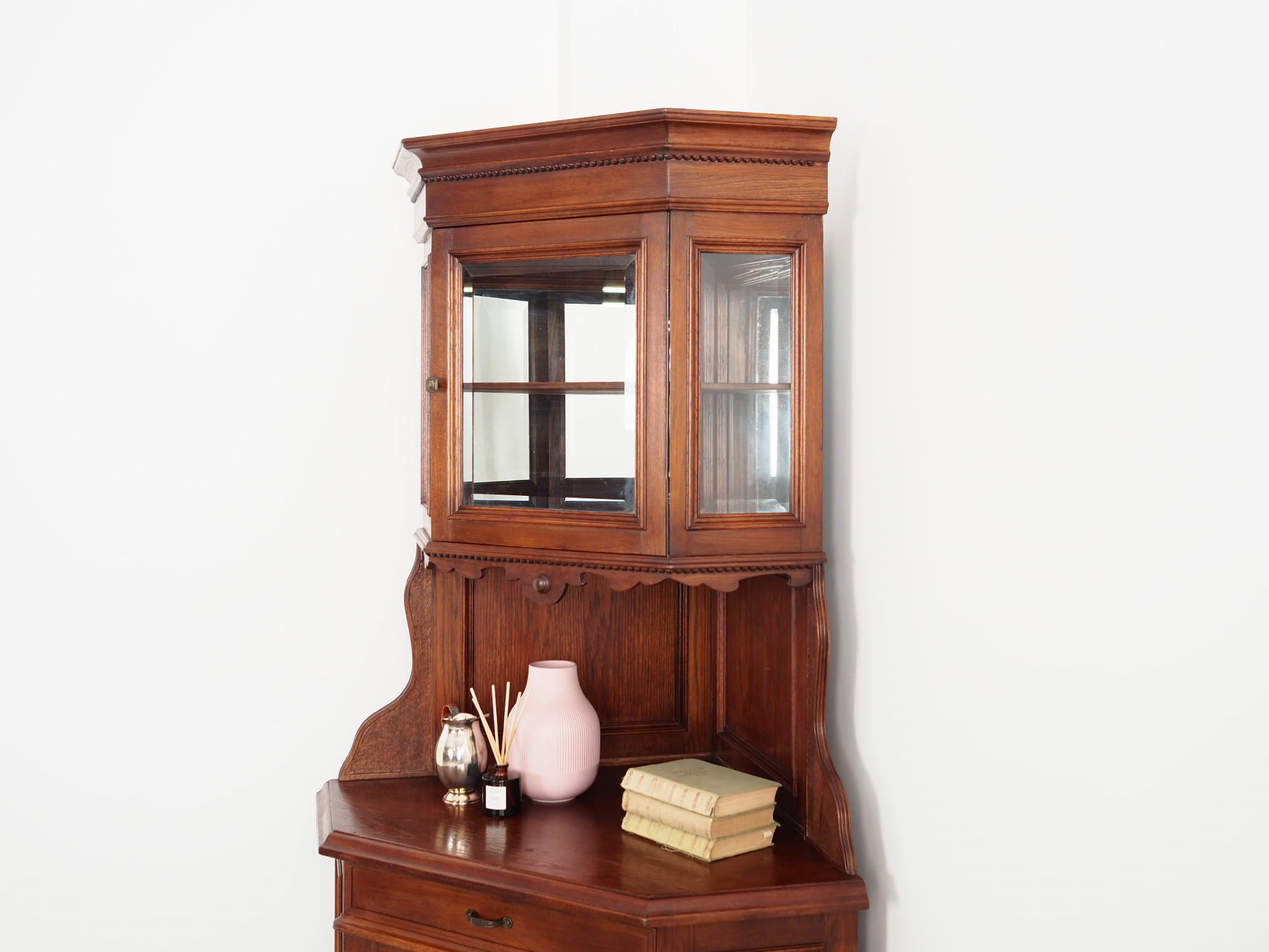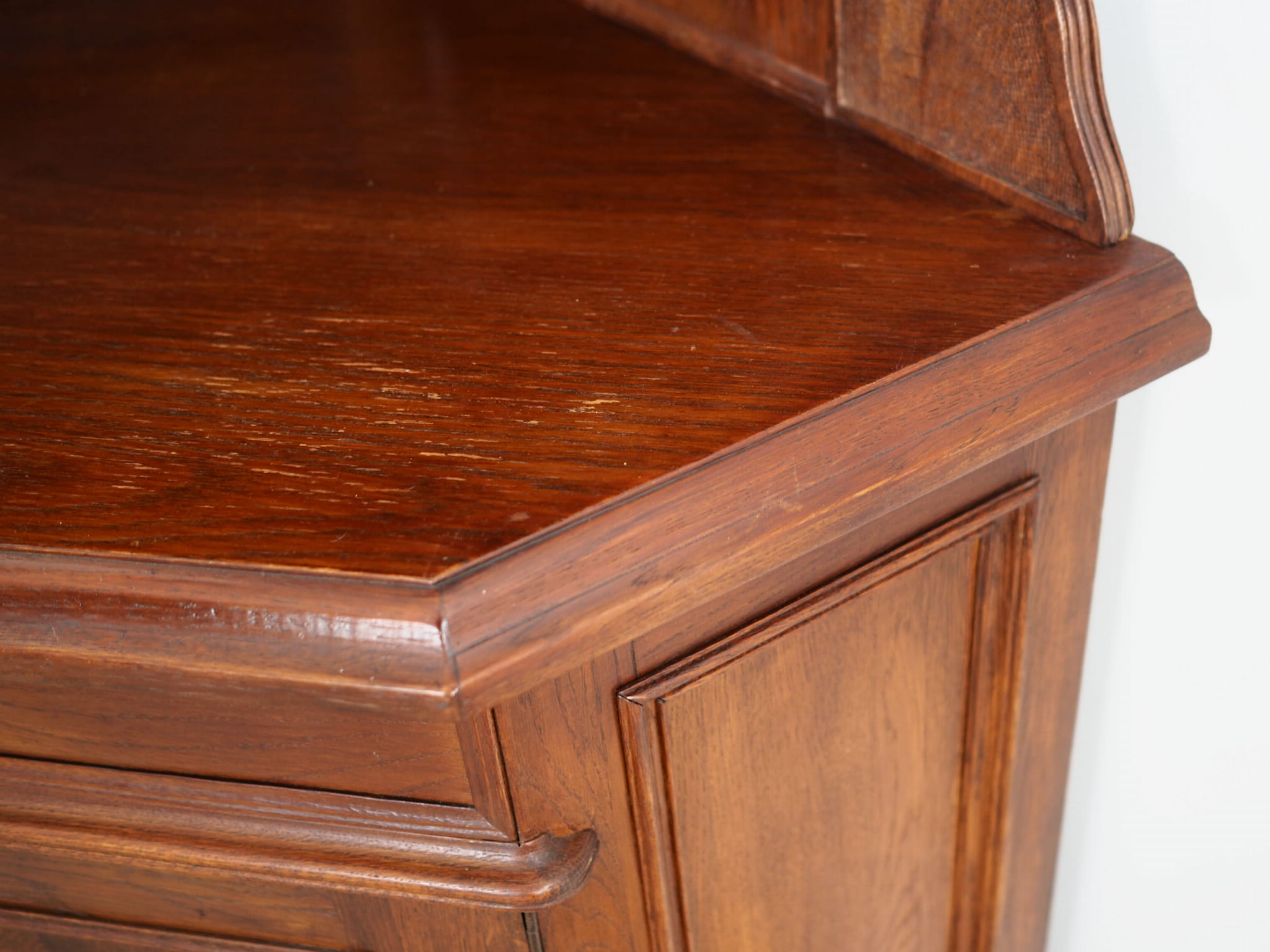 Konstrukcja wykonana z litego drewna dębowego. Powierzchnia po odświeżeniu. Wewnątrz przestrzeń została wypełniona dwiema pojemnymi szafkami oraz praktyczną szufladą. W szafkach umieszczono półki bez możliwości regulacji wysokości. Mebel z klasycznym rozwiązaniem drzwi otwieranych, dzięki czemu mamy swobodny dostęp do całego wnętrza mebla. Klucz w zestawie.