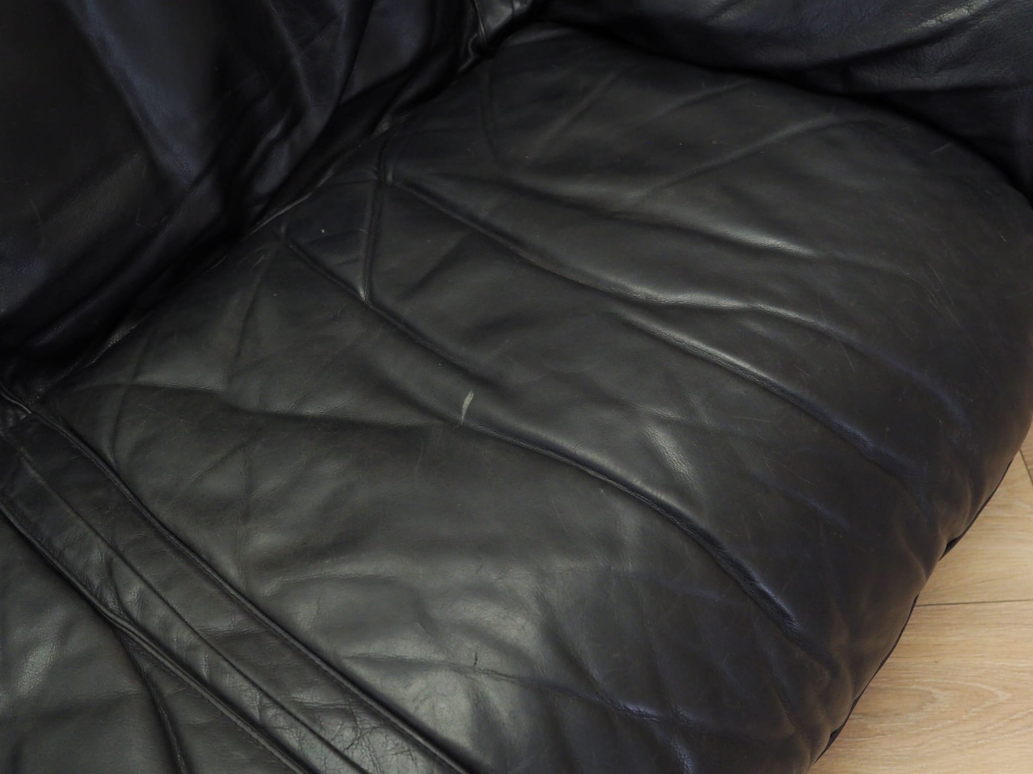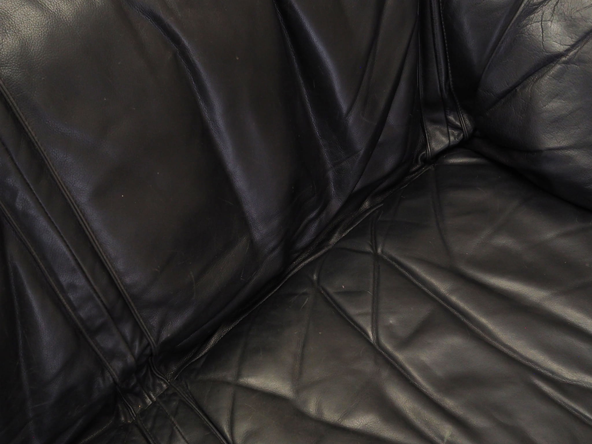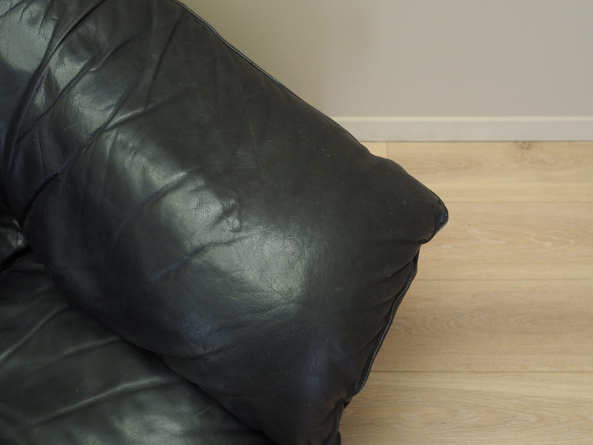 Konstrukcja została wykonana z litego drewna. Sofa zachowana jest w oryginalnej, wysokiej jakości skórze naturalnej w kolorze czarnym.