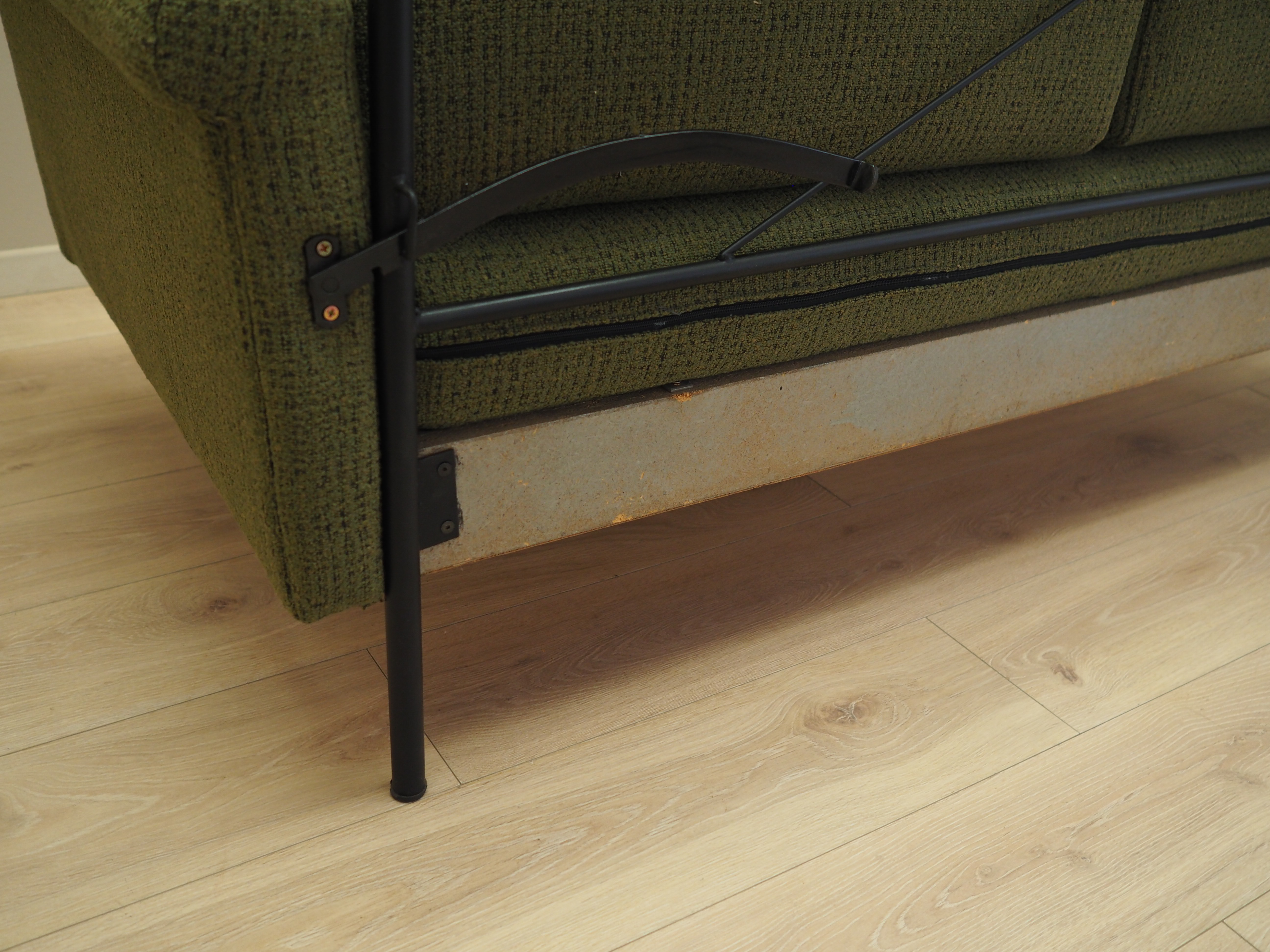 Nogi mebla wykonane z metalu. Sofa została poddana renowacji tapicerskiej, gąbki oraz tkanina wymienione na nowe. Tapicerka wykonana w kolorze zielonym, wykorzystana została wysokogatunkowa tkanina.
