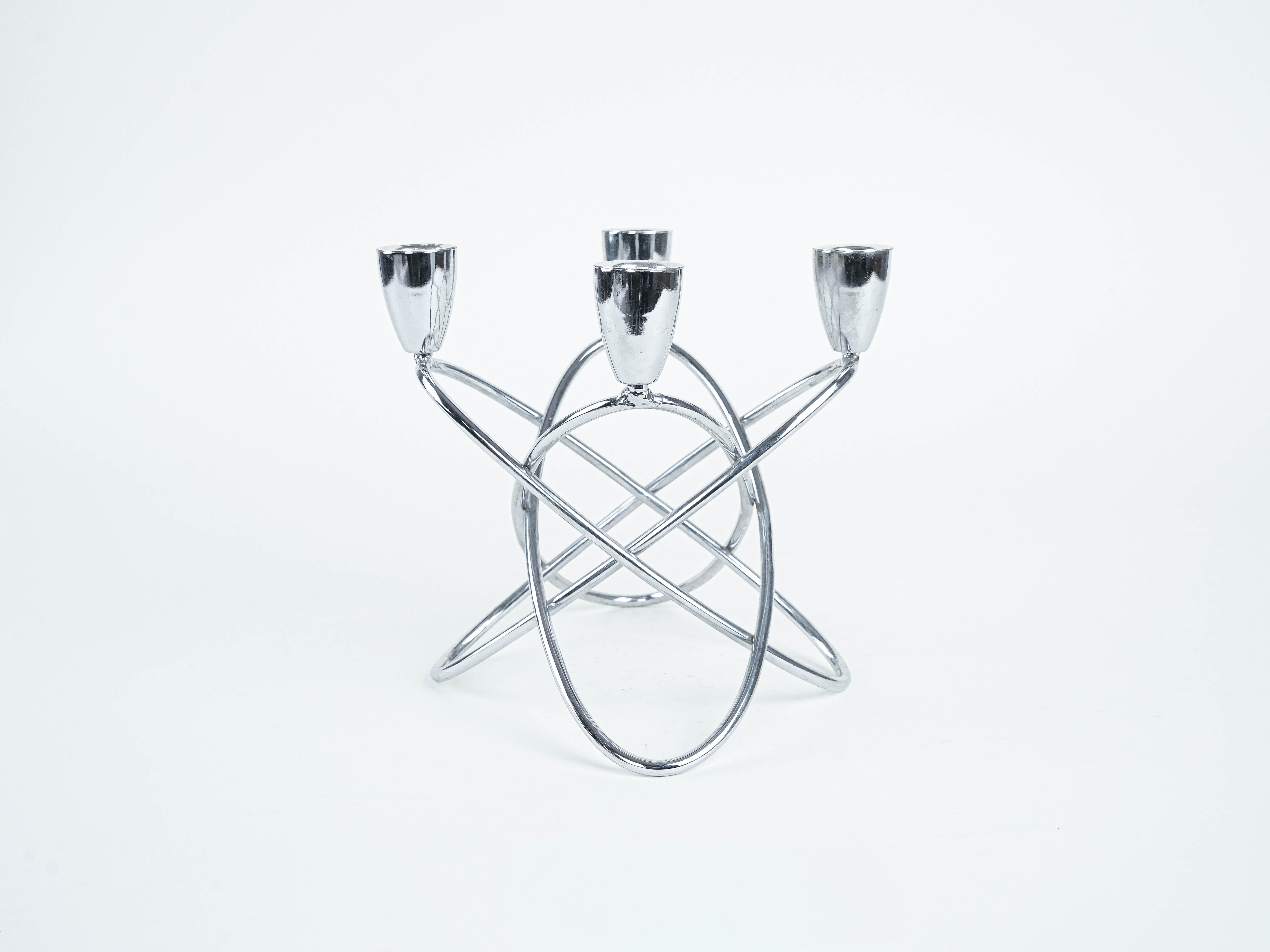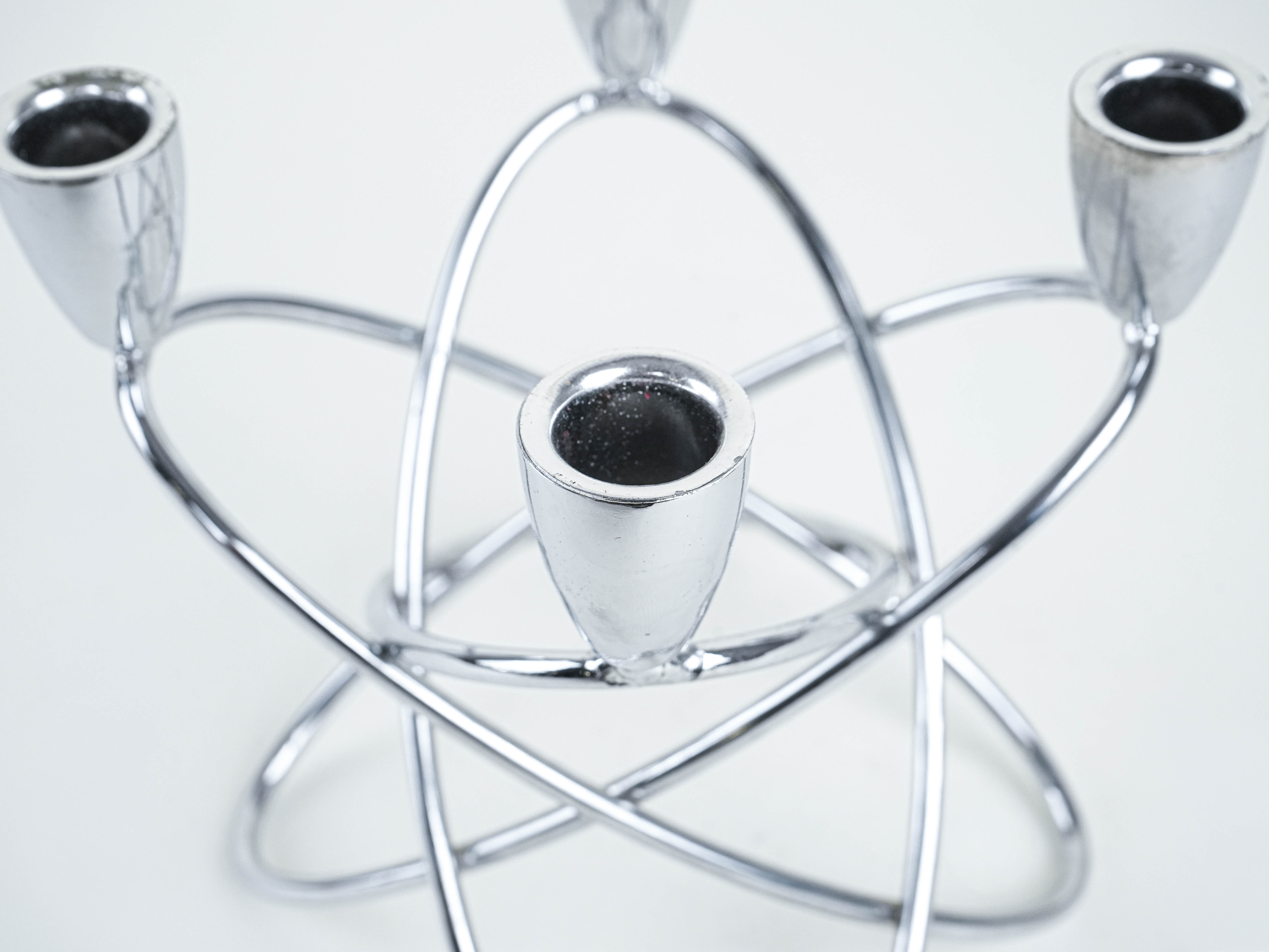 Geometryczny świecznik z połowy XX wieku wykonany z chromowanego metalu. Minimalistyczna, rzeźbiarska forma w stylu modernistycznym sprawia, że świetnie prezentuje się zarówno jako dekoracja, jak i użytkowy element wnętrza. Idealny do aranżacji w klimacie vintage, mid-century lub nowoczesnym.