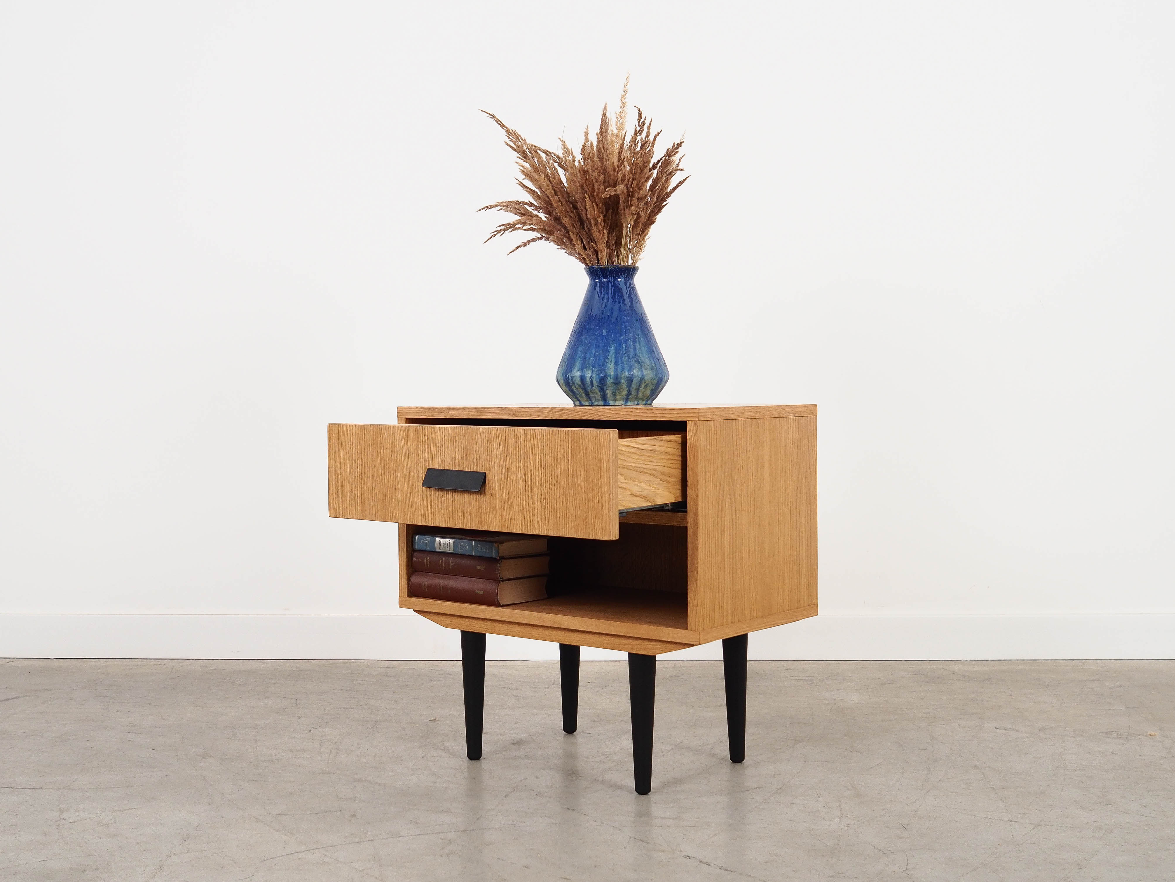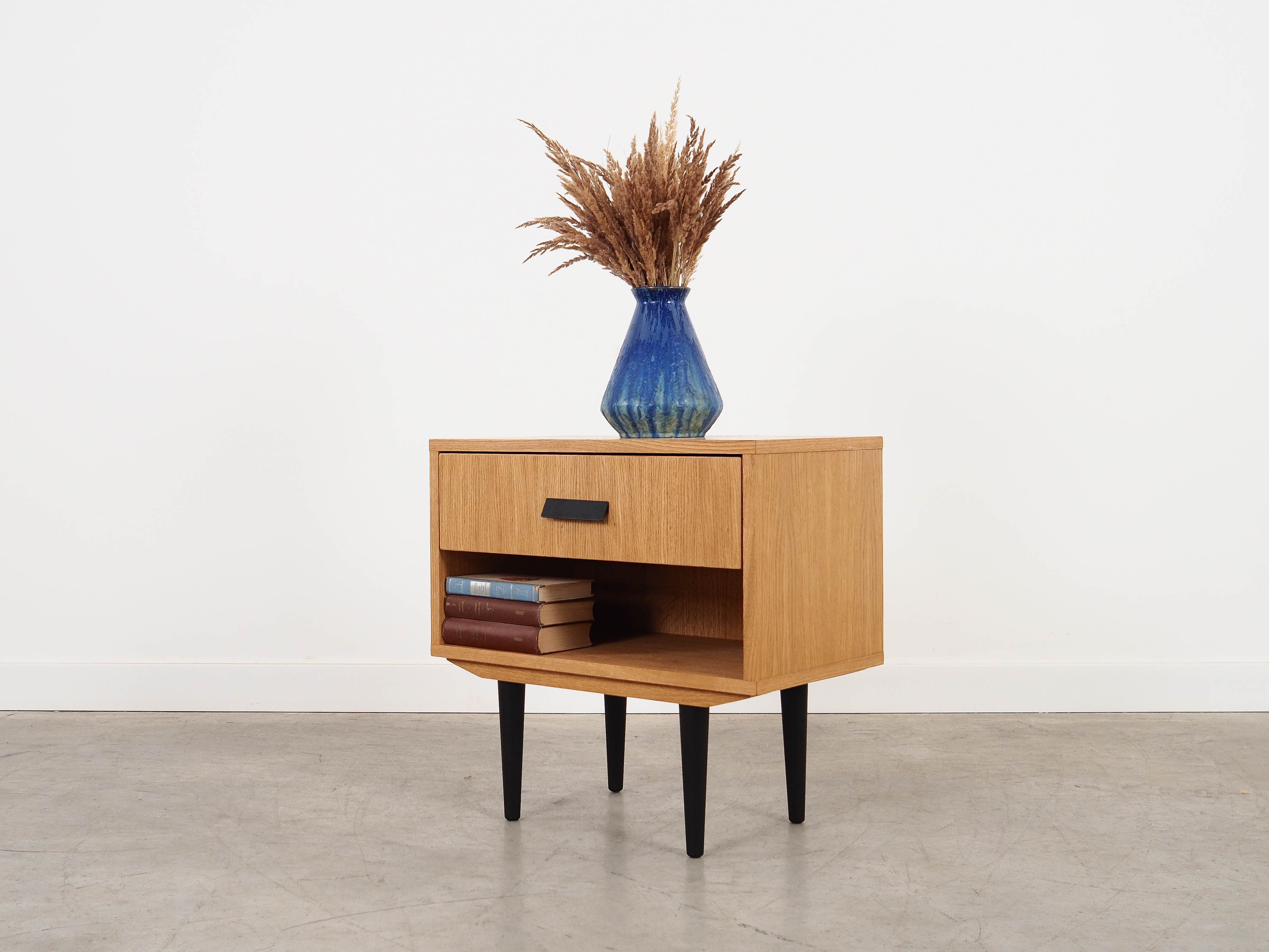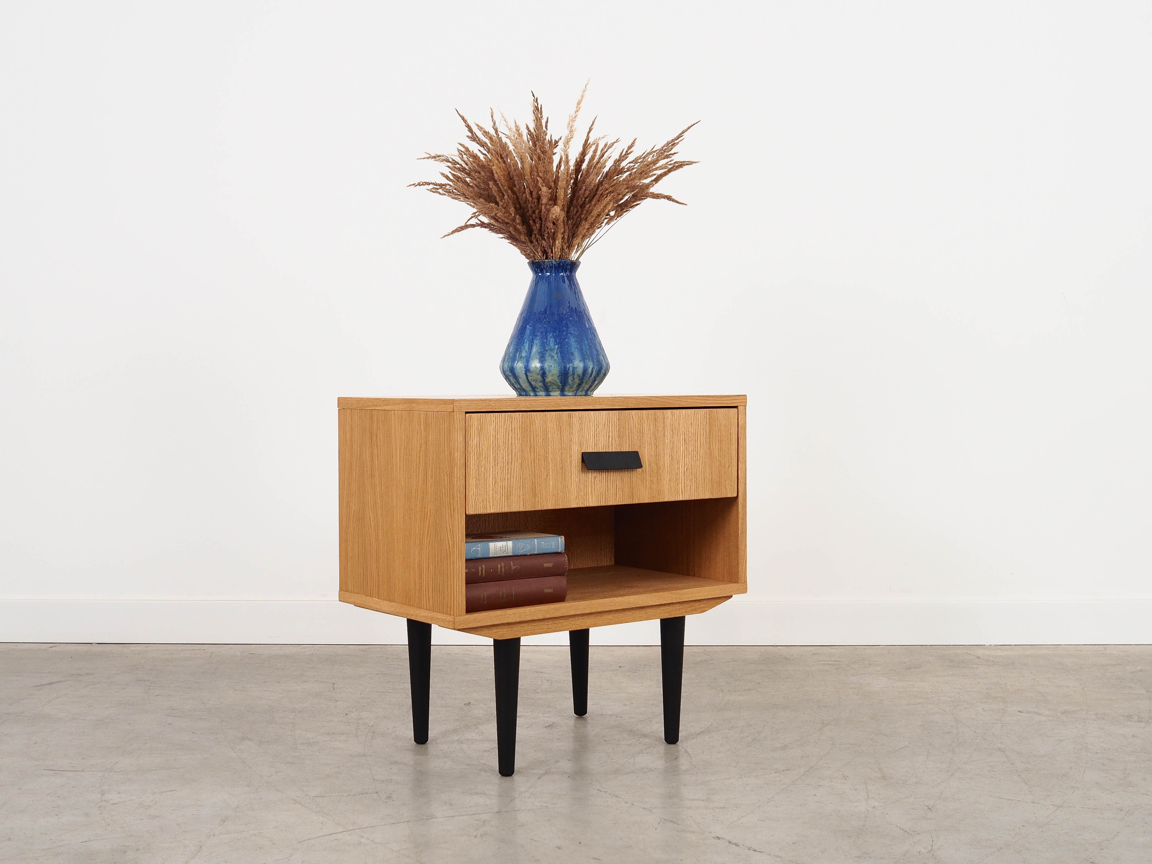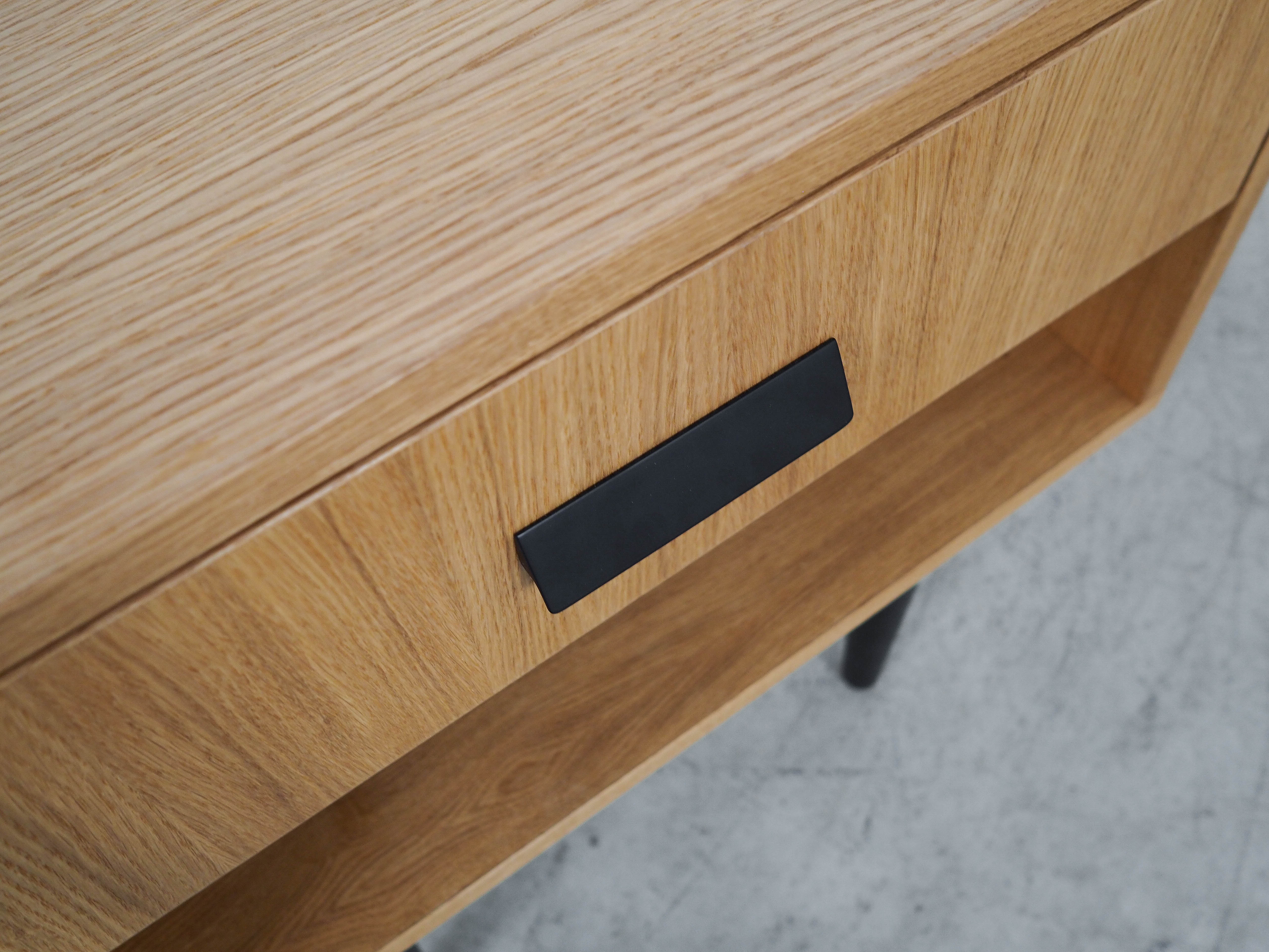 Konstrukcja pokryta jest fornirem dębowym. Nogi wykonane są z litego drewna wybarwionego na kolor czarny. Powierzchnia po odświeżeniu. Wewnątrz przestrzeń została wypełniona praktyczną szufladą oraz pojemną wnęką.