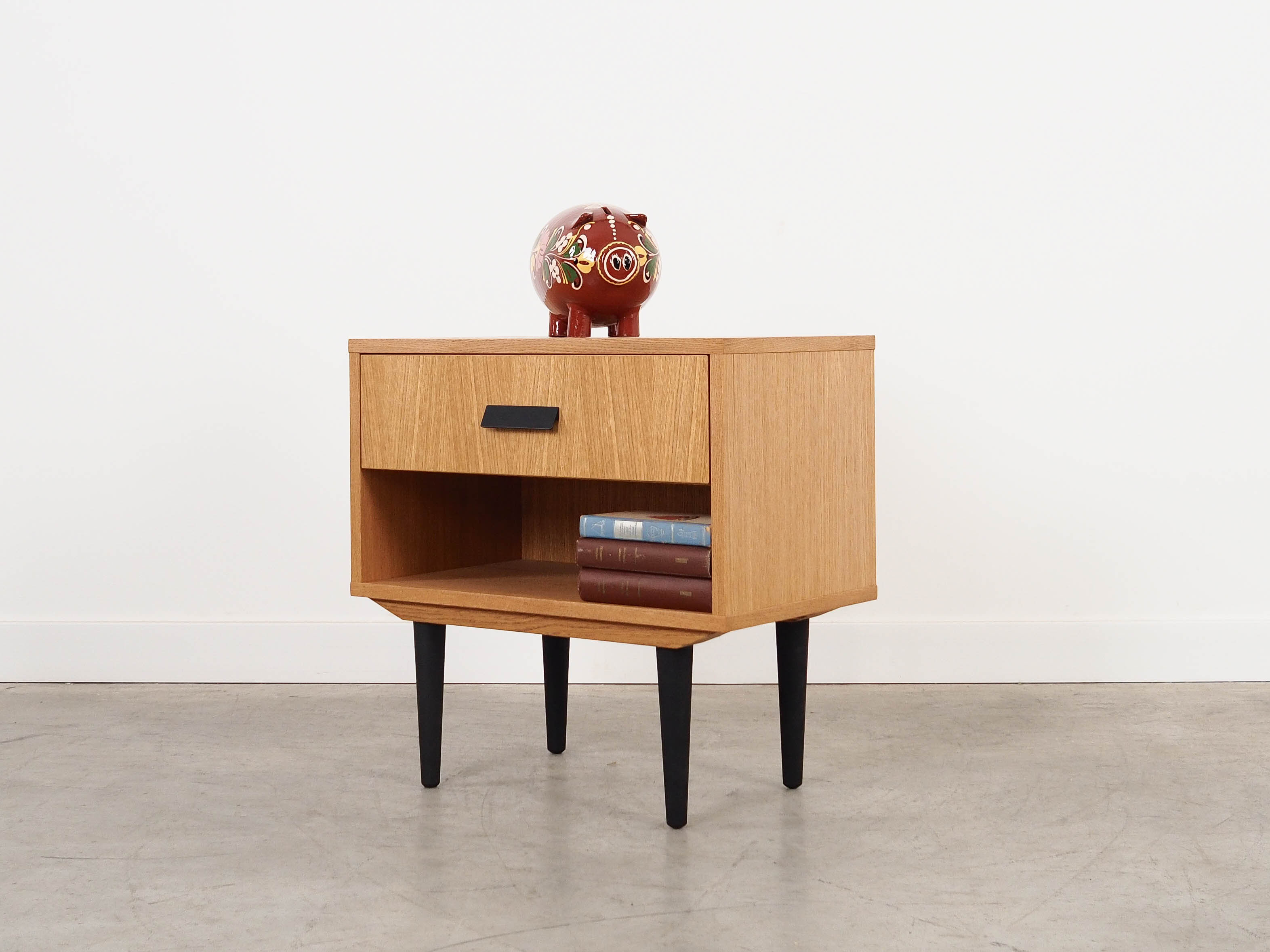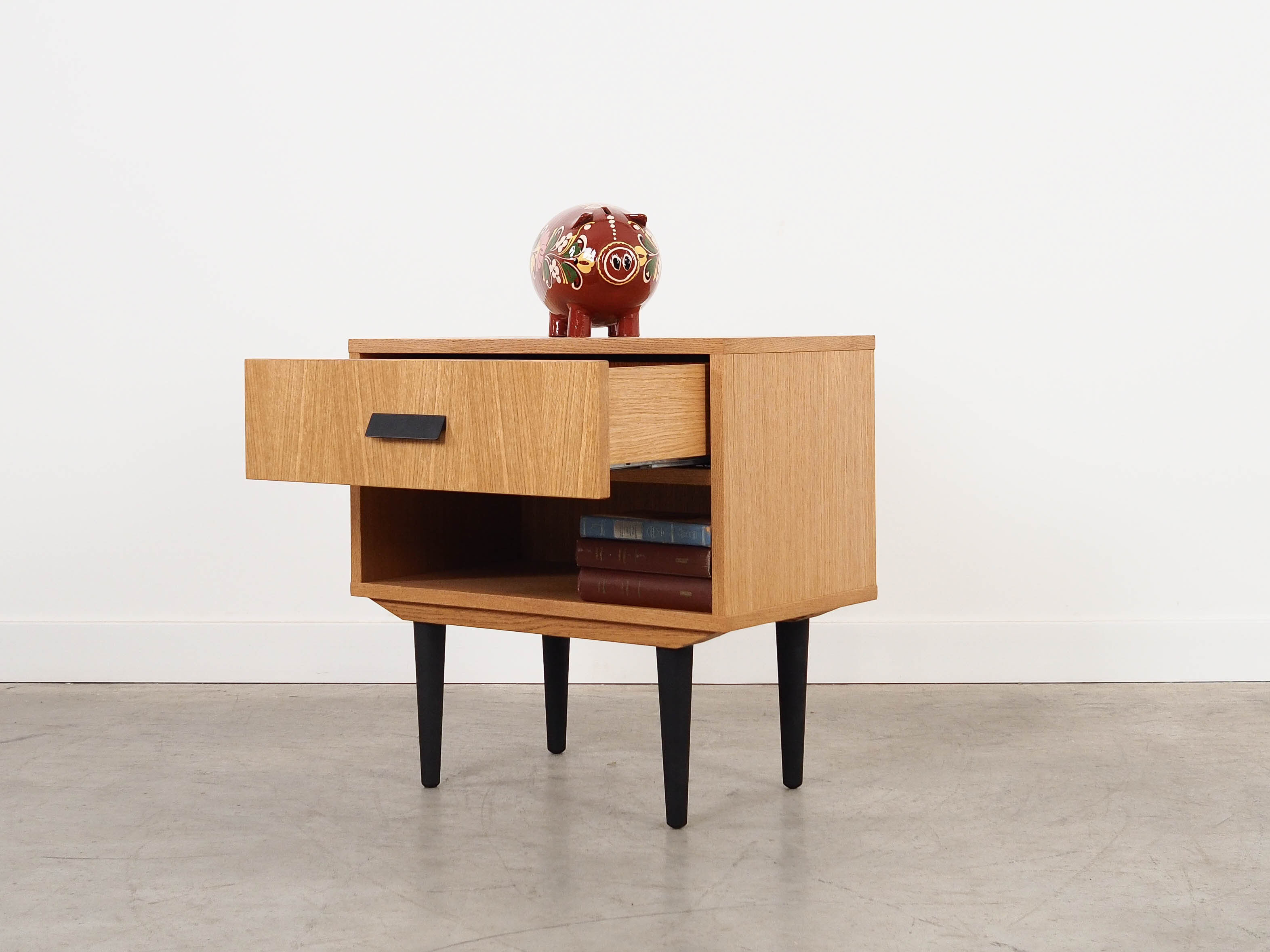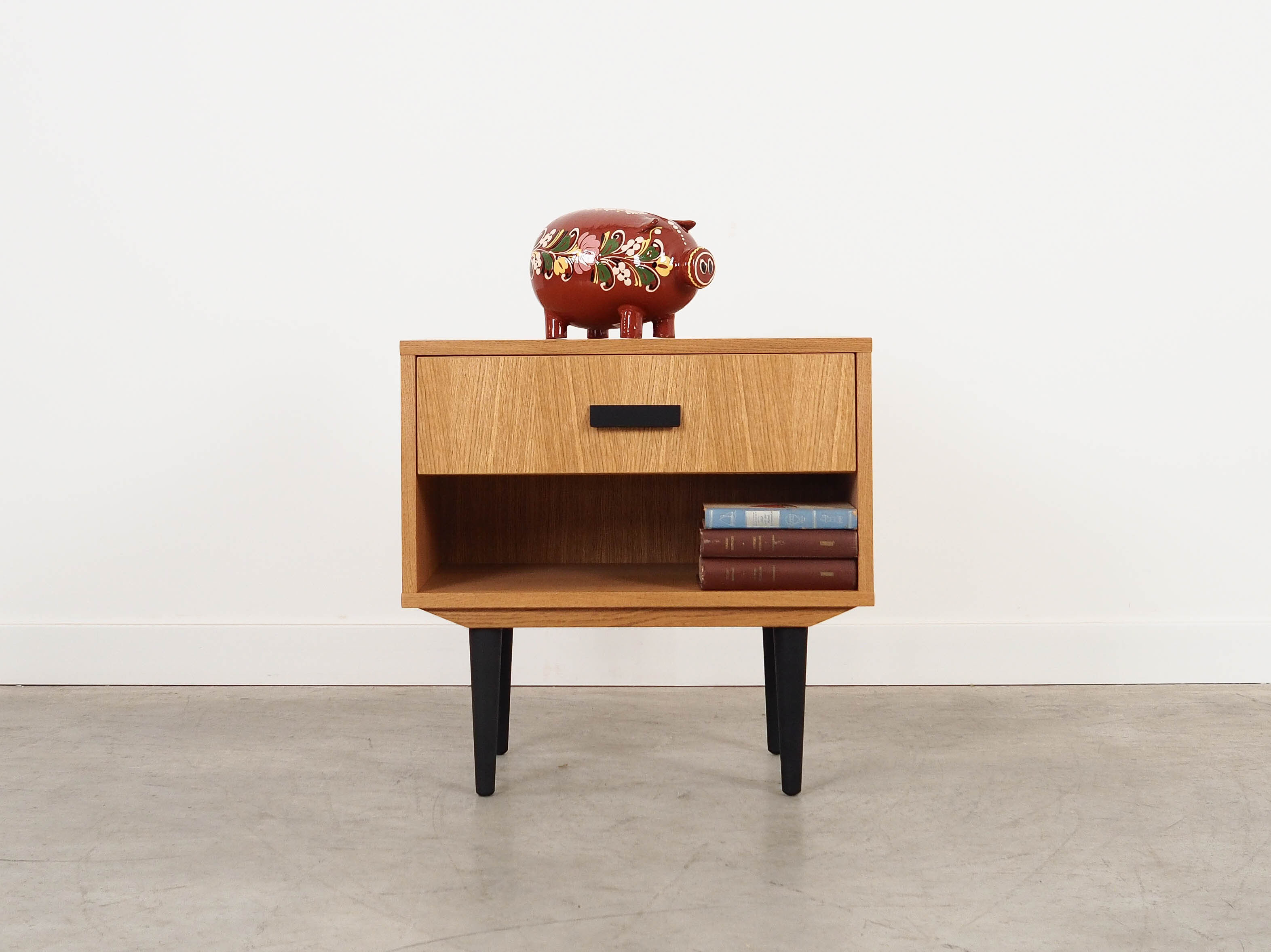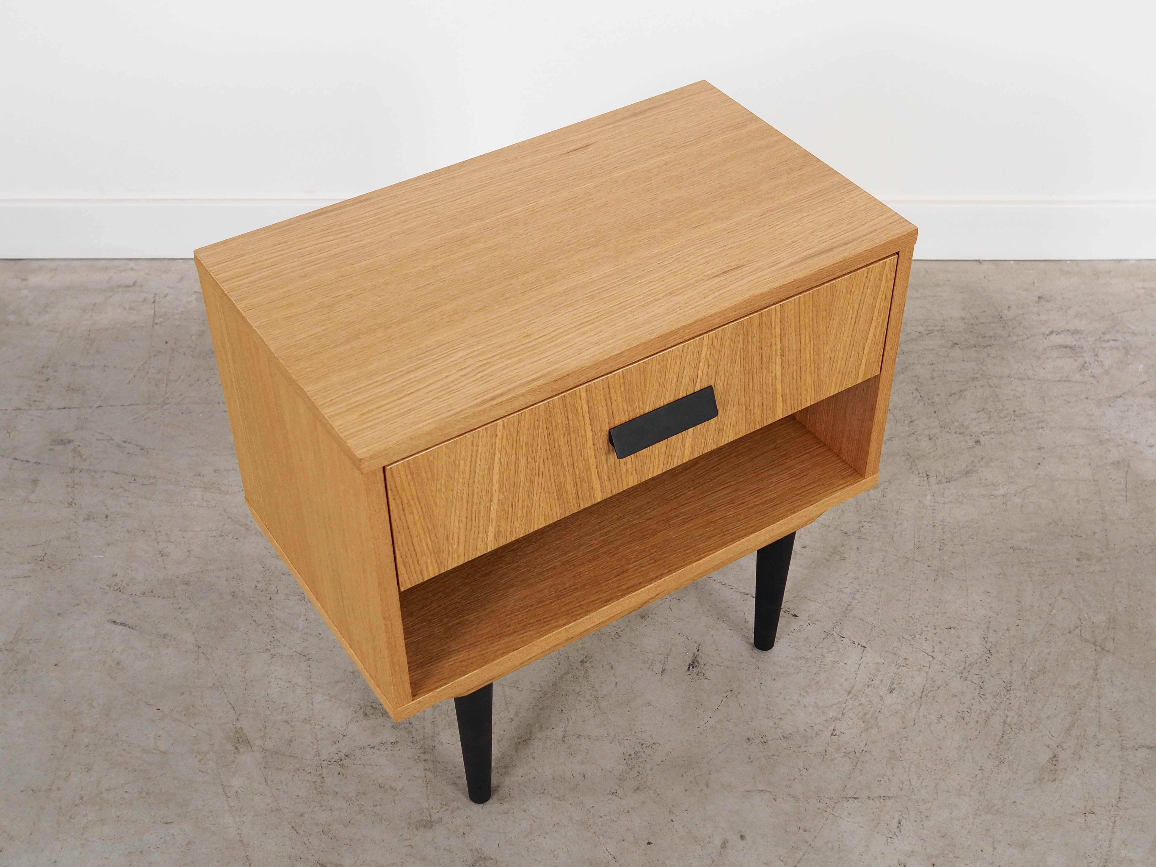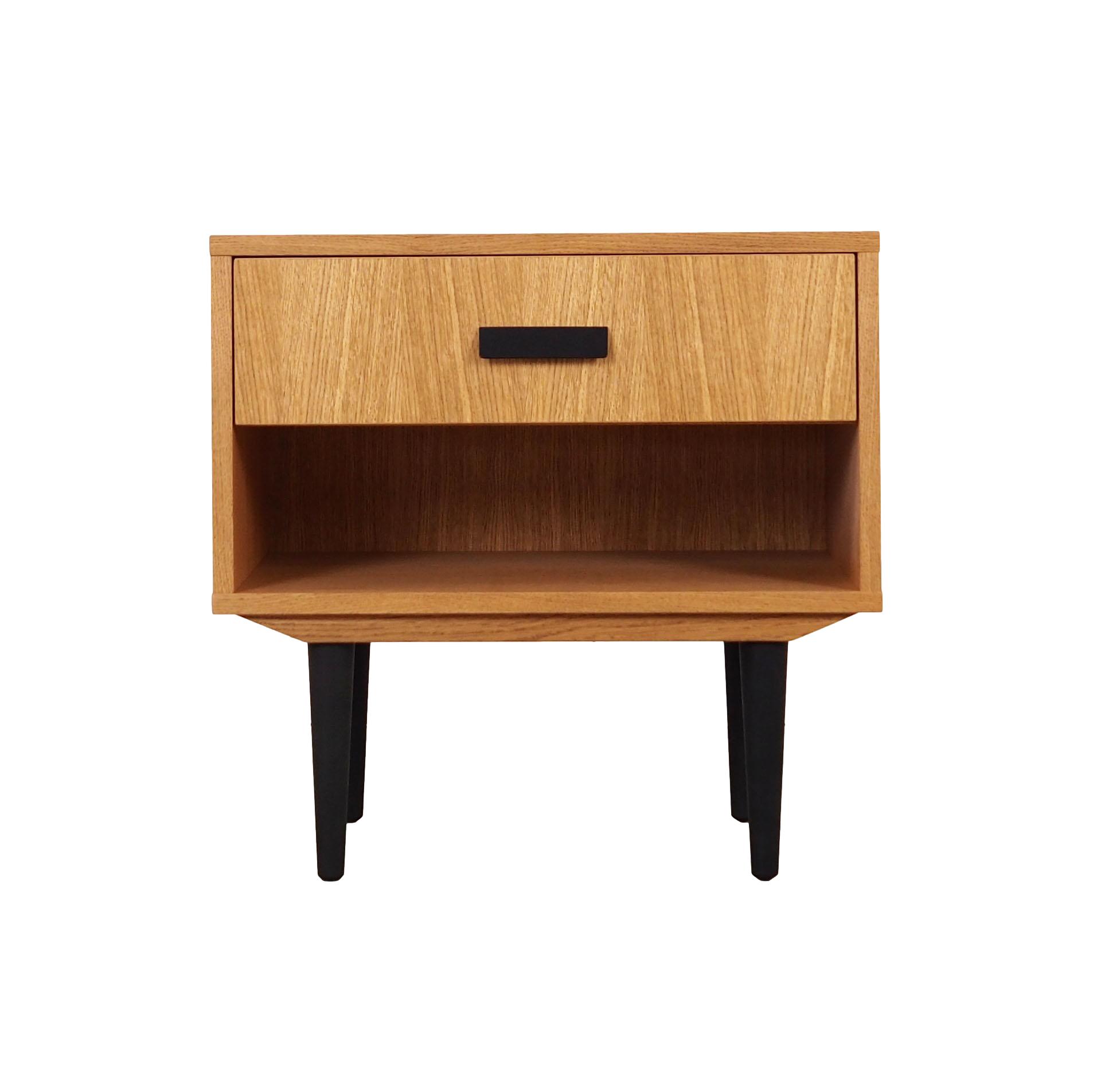 Konstrukcja pokryta jest fornirem dębowym. Nogi wykonane są z litego drewna wybarwionego na kolor czarny. Powierzchnia po odświeżeniu. Wewnątrz przestrzeń została wypełniona praktyczną szufladą oraz pojemną wnęką.