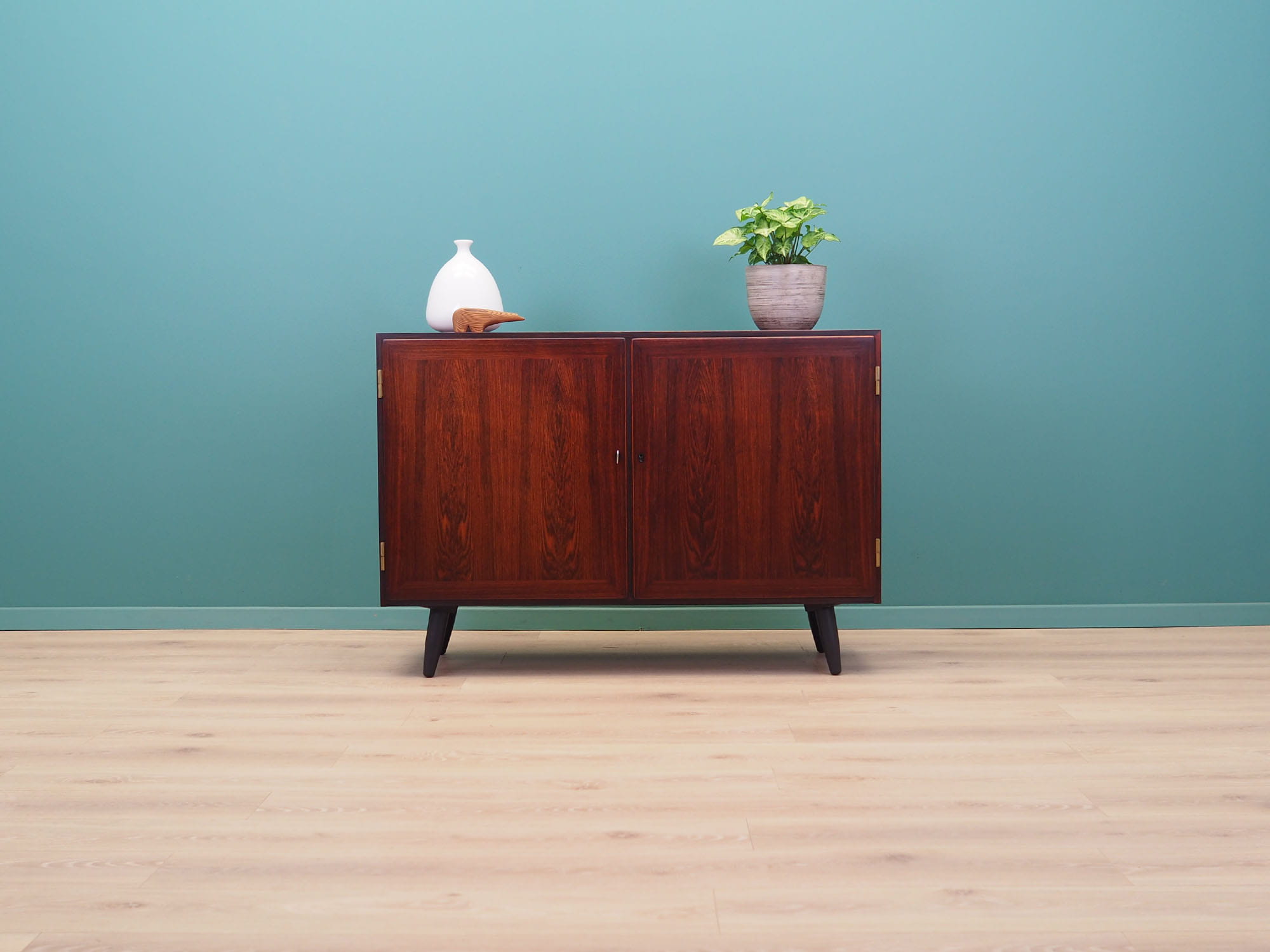 Konstrukcja pokryta jest fornirem palisandrowym. Nogi zostały wykonane z litego drewna wybarwionego na kolor czarny. Powierzchnia po odświeżeniu. Wewnątrz przestrzeń została wypełniona dwiema praktycznymi półkami z możliwością regulacji wysokości. Mebel z klasycznym rozwiązaniem drzwi otwieranych, dzięki czemu mamy wygodny dostęp do całego wnętrza. Zamek sprawny, klucz w zestawie.