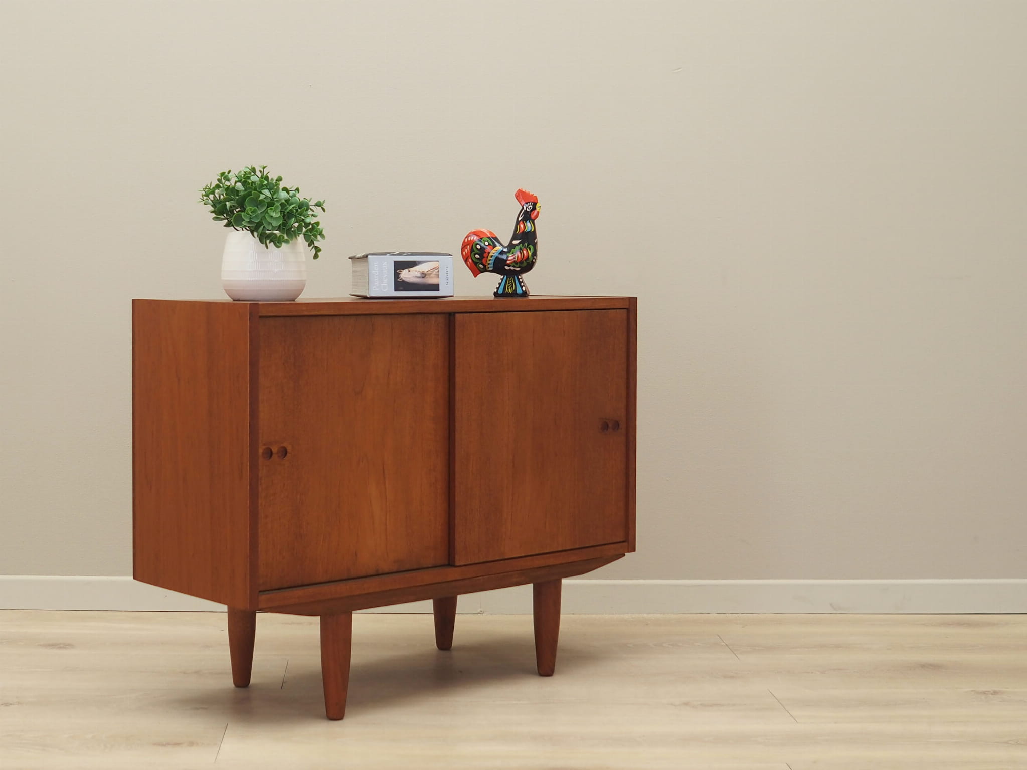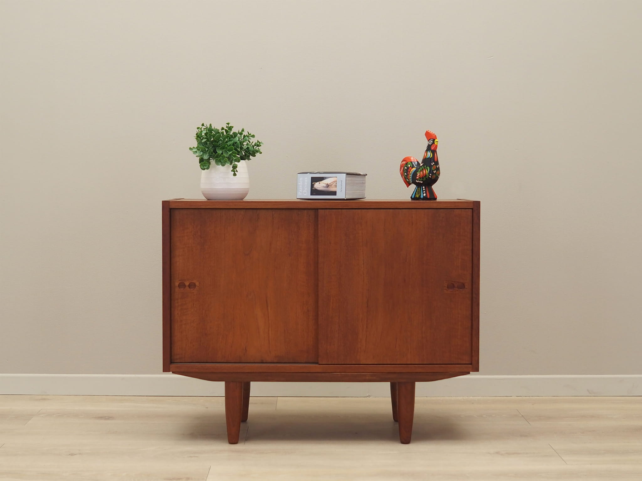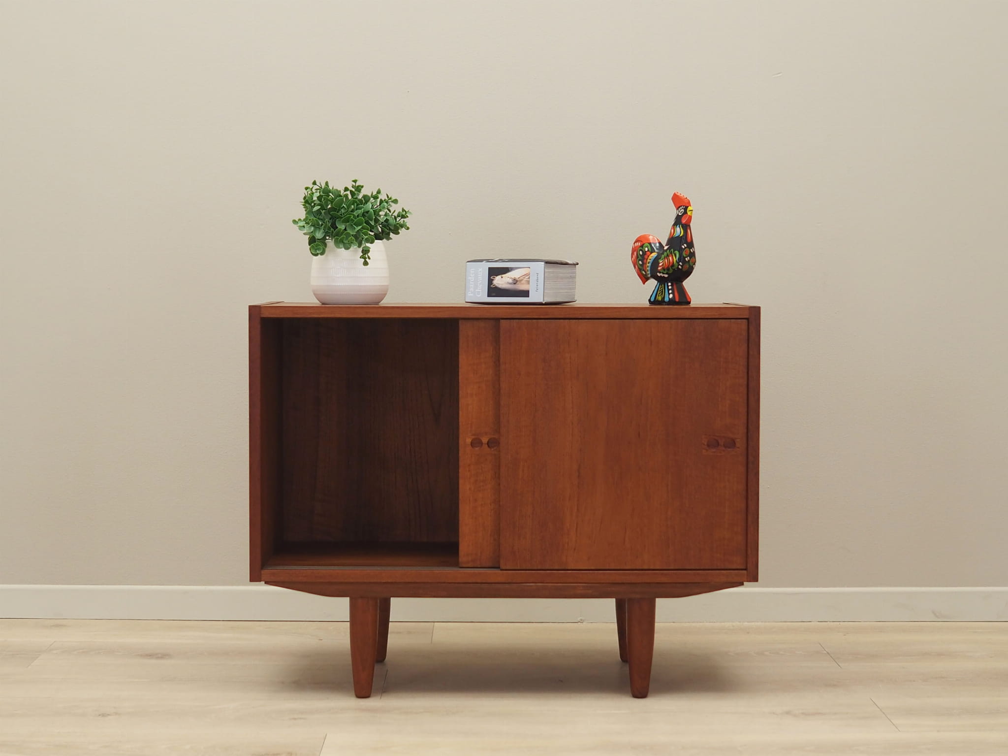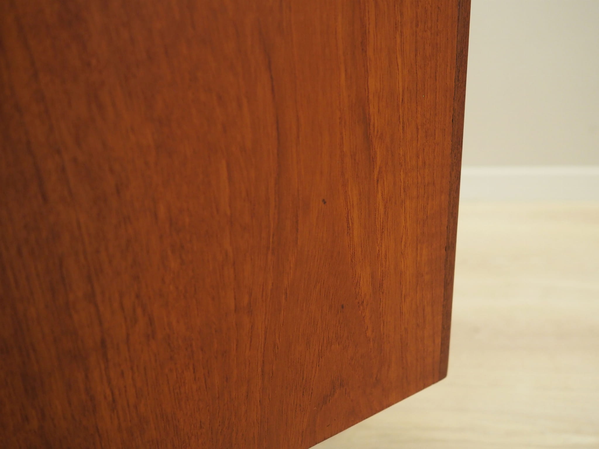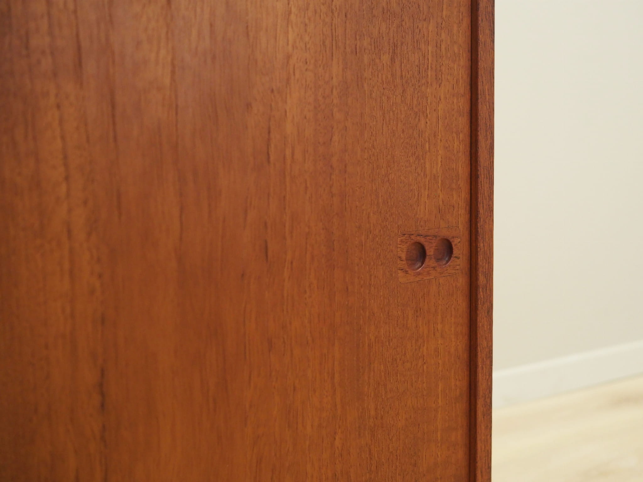 Konstrukcja pokryta jest fornirem tekowym. Nogi zostały wykonane z litego drewna. Powierzchnia po odświeżeniu. Szafka posiada praktyczne rozwiązanie drzwi przesuwnych, dzięki czemu ograniczamy konieczność pozostawienia dużej wolnej przestrzeni przed meblem jednocześnie nie ograniczając sobie dostępu do wnętrza mebla. Ponadto przesuwne drzwi są idealnym rozwiązaniem, aby wykorzystać mebel pod sprzęt audio.