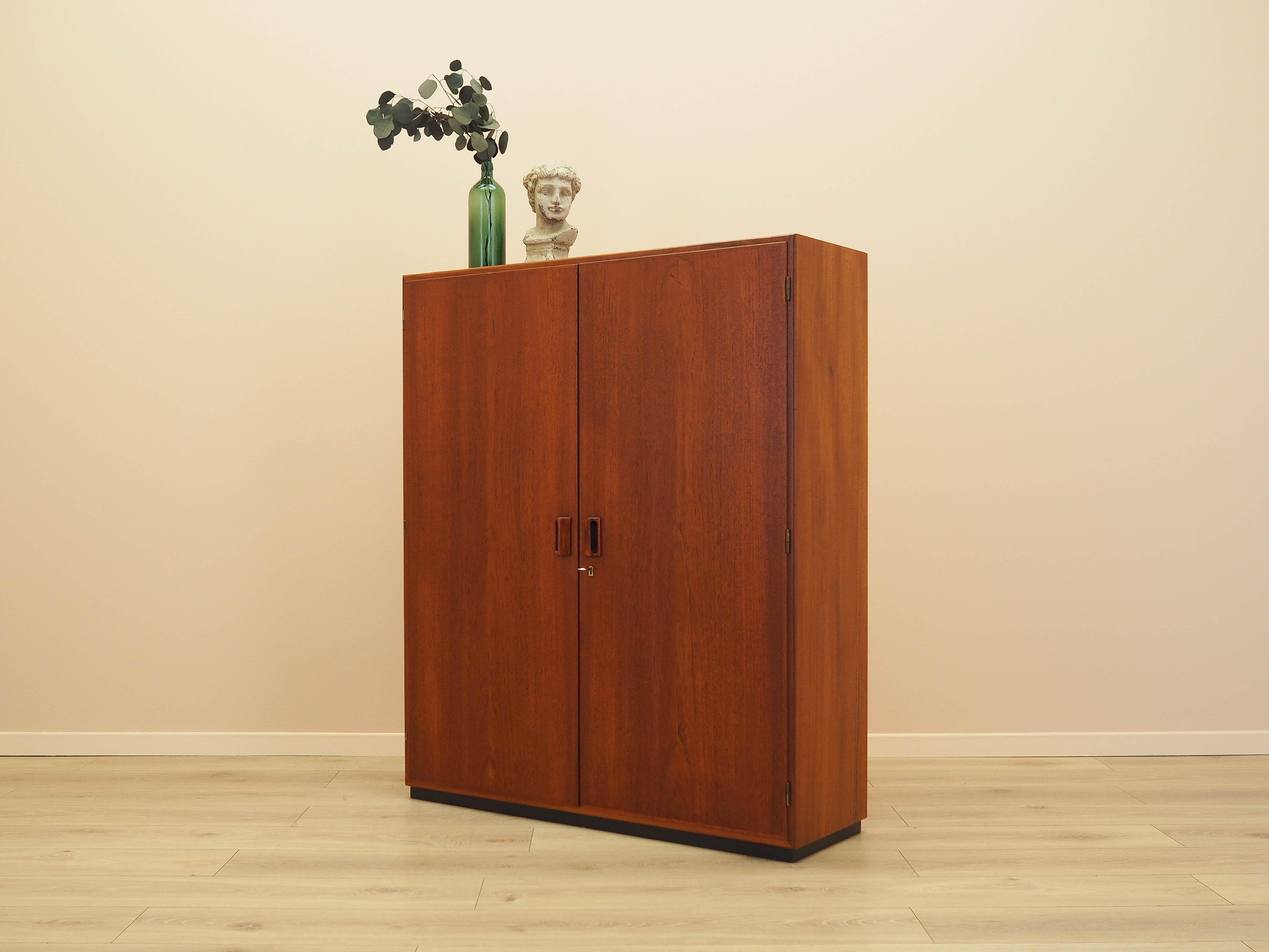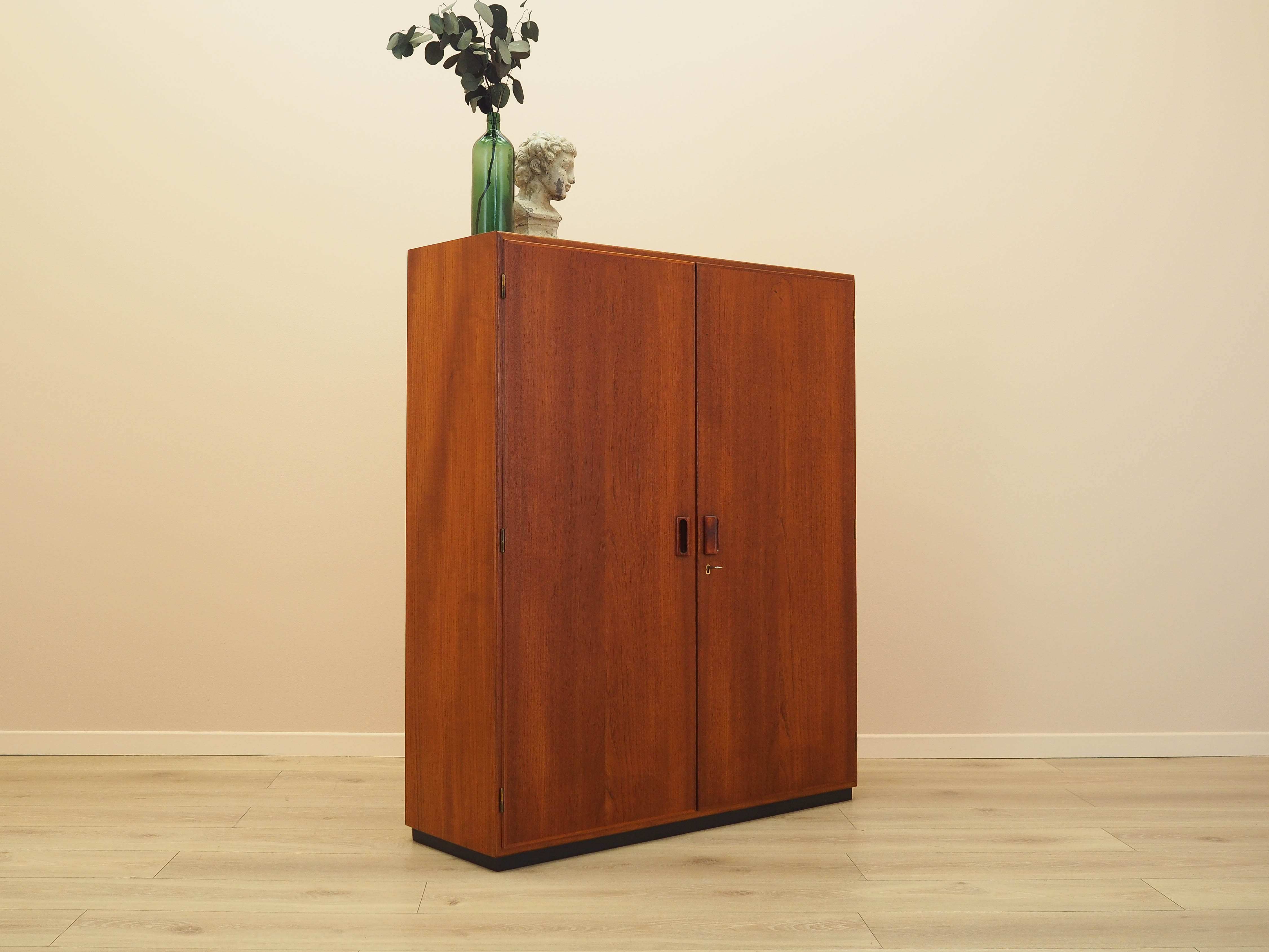 Konstrukcja pokryta jest fornirem tekowym. Mebel umieszczony został na drewnianym cokole. Powierzchnia po odświeżeniu. Wewnątrz przestrzeń została wypełniona trzema praktycznymi półkami z możliwością regulacji wysokości. Szafka z klasycznym rozwiązaniem otwieranych drzwi, dzięki którym mamy swobodny dostęp do całego wnętrza mebla. Klucz w zestawie.