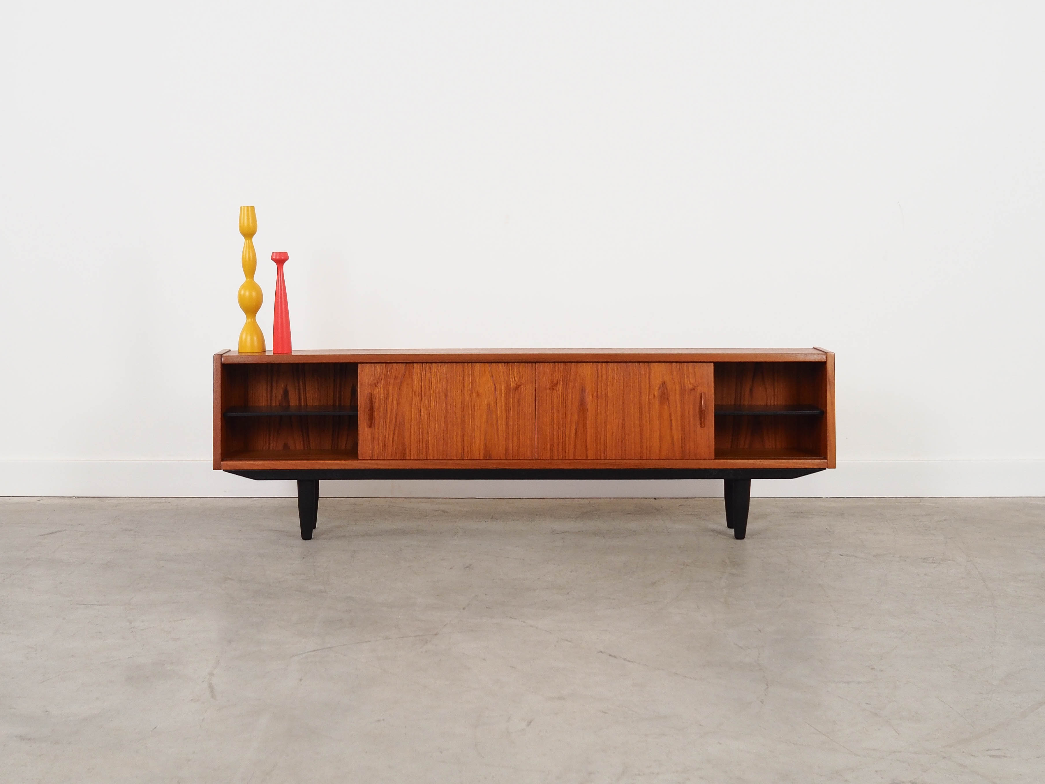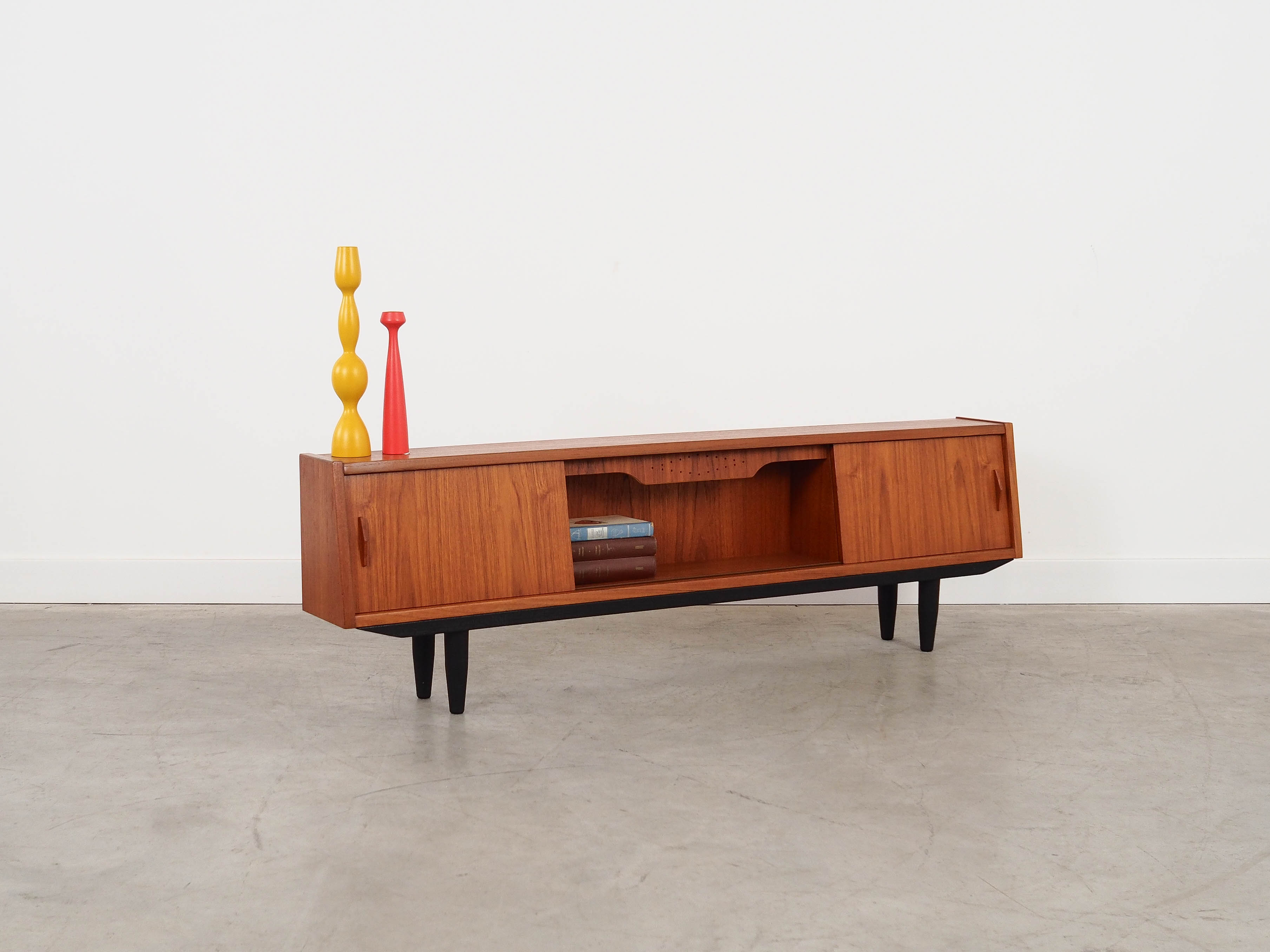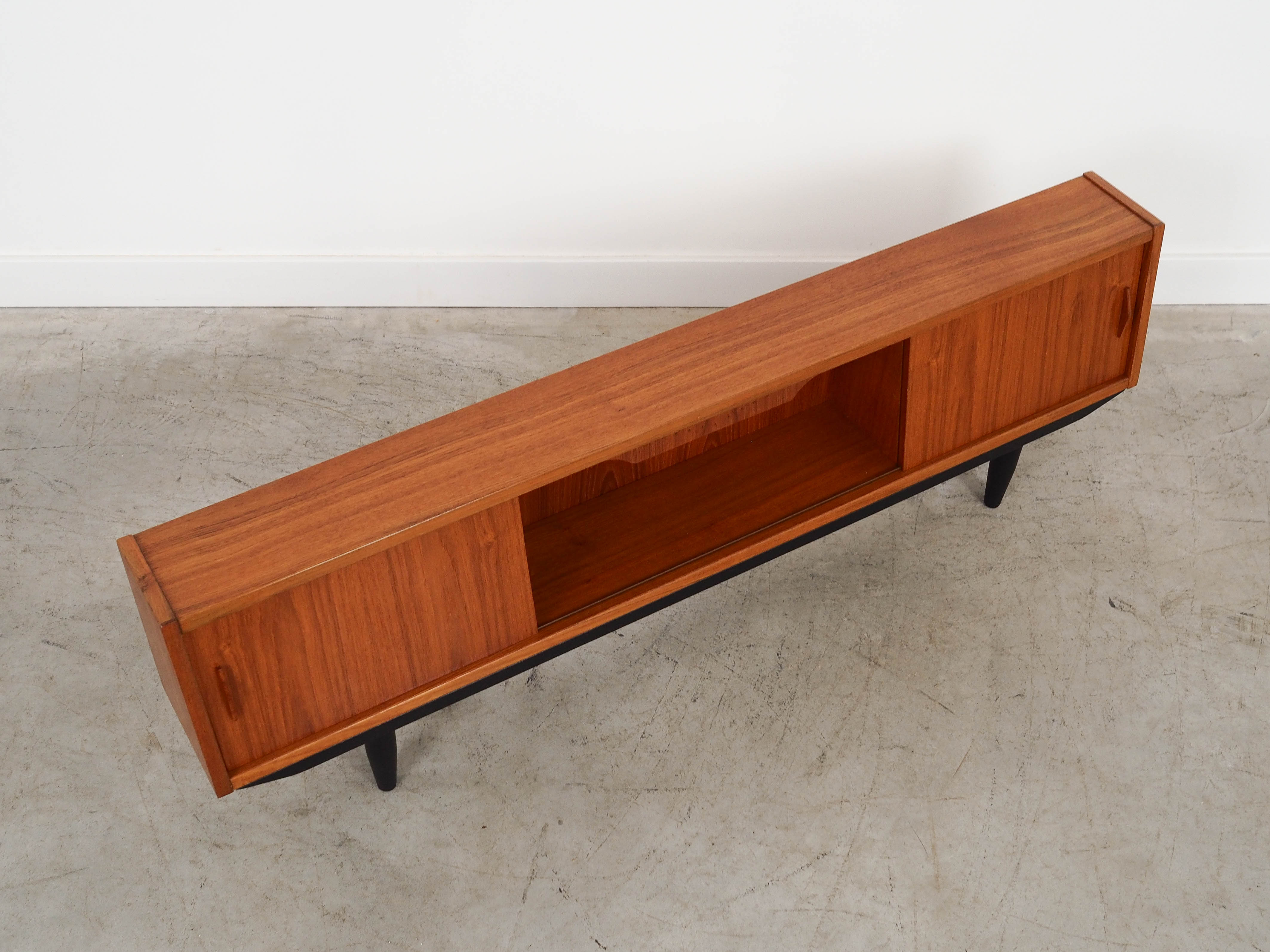 Konstrukcja pokryta jest fornirem tekowym. Nogi wykonane z litego drewna wybarwionego na kolor czarny. Powierzchnia po odświeżeniu. Wewnątrz przestrzeń została wypełniona dwiema praktycznymi półkami. Szafka posiada wygodne rozwiązanie drzwi przesuwnych, dzięki czemu ograniczamy konieczność pozostawienia dużej wolnej przestrzeni przed meblem, jednocześnie nie ograniczając dostępu do jego wnętrza. Dodatkowym atutem jest podświetlenie.