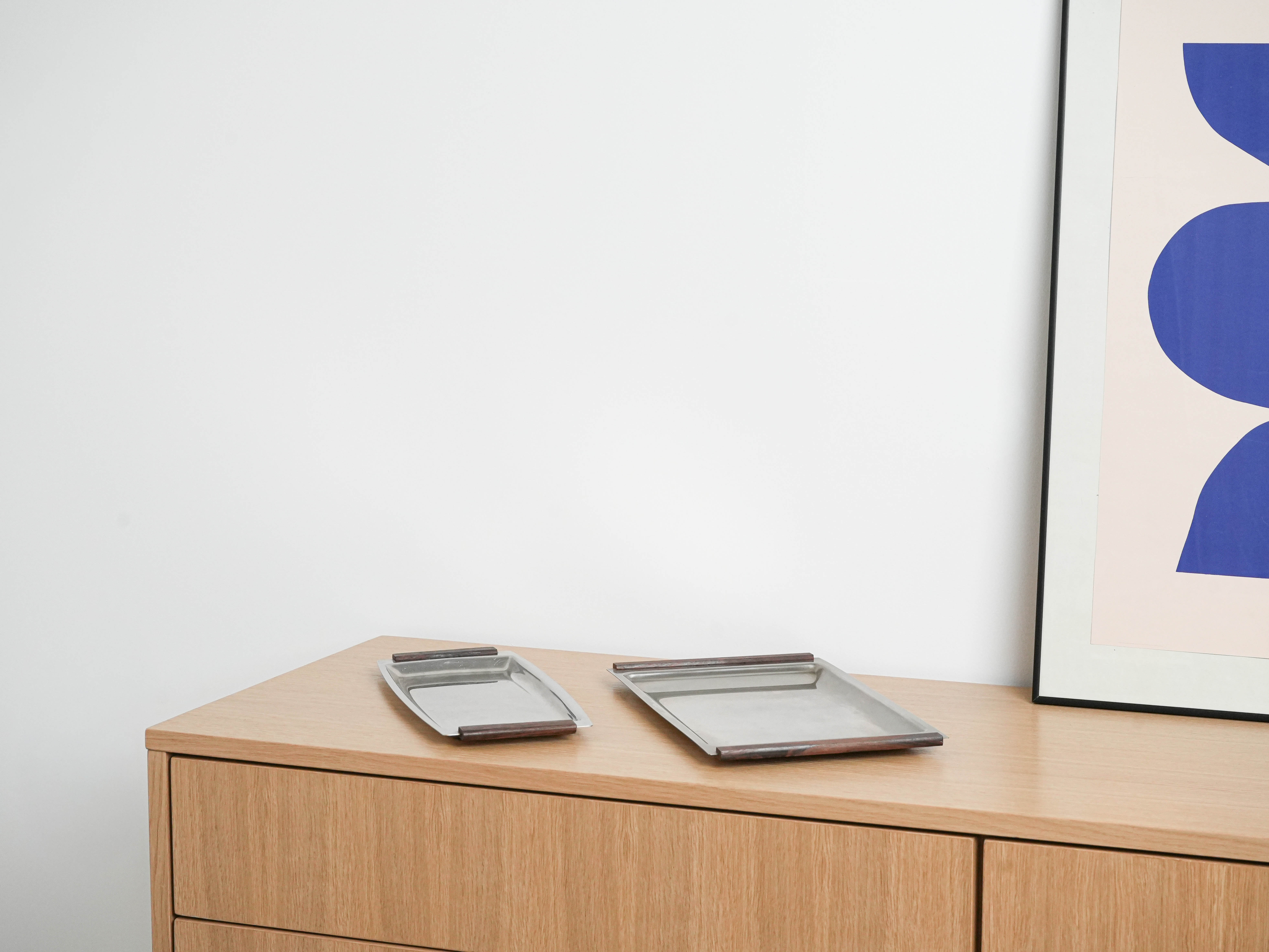 Vintage taca w stylu skandynawskiego modernizmu z lat 60.–70. XX wieku, wykonana ze stali nierdzewnej z charakterystycznymi uchwytami z drewna. Prosty, geometryczny kształt i połączenie naturalnych materiałów wpisują się w estetykę projektów takich marek jak Dansk Designs czy Stelton. Idealna jako element kolekcji mid-century, ale także praktyczna w użyciu – do serwowania, jako dekoracja stołu lub baza pod aranżacje.
